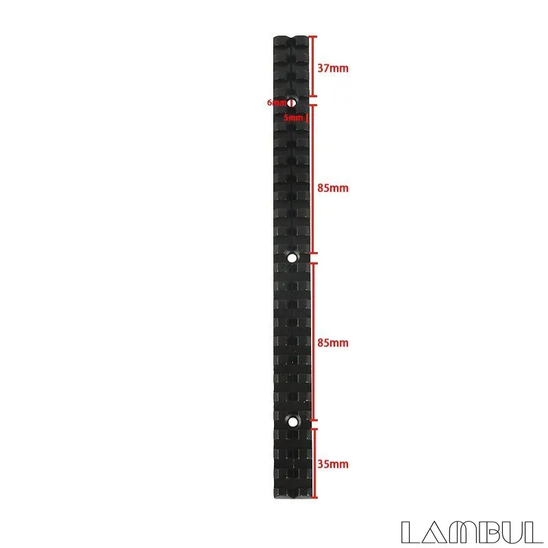 Características: - Este artículo acepta todos los anillos estándar Weaver que mejorarán sus armas de fuego de una manera que solo el Weaver pueda hacerlo. - Tipo de carril: Picatinny y weaver - Completo con tornillos para una fácil instalación. - Número de ranuras para anillos: 25 que facilitan la configuración del relieve ocular y encuentran la ubicación más deseada de visores o miras de punto rojo encima del receptor. - Diseño ligero Material: Aluminio Peso del paquete: 0,142 kg