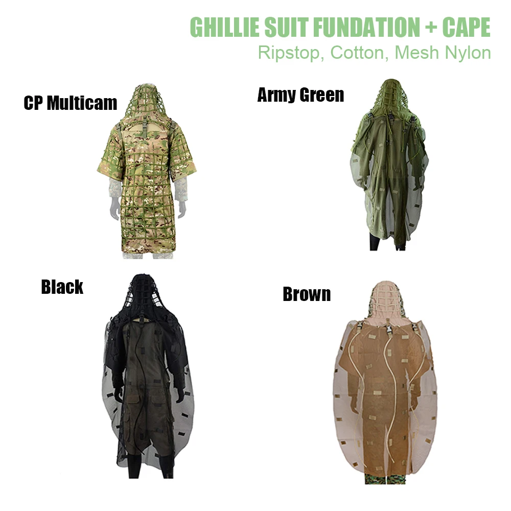 -Army Green/Black/Brown: Ghillie suit fundation in Washable Cotton material, and Cape in Mesh Nylon Fabric material