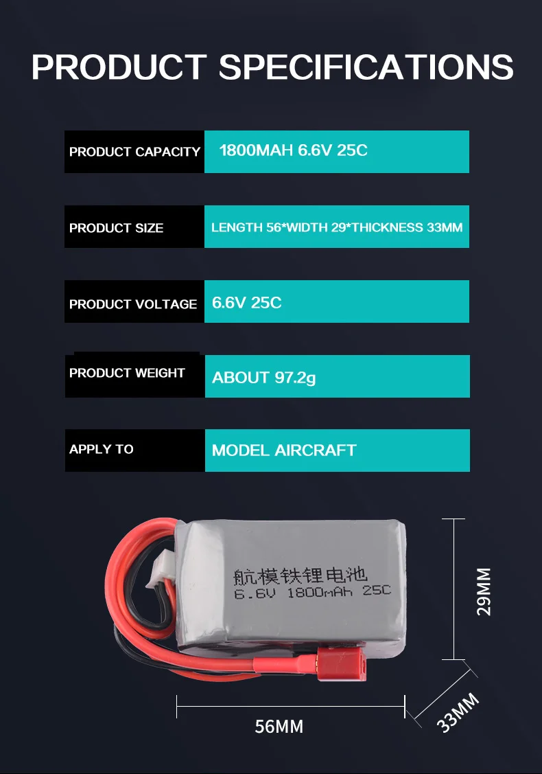 Batería de Control remoto del receptor, paquete de receptor de 6,6 V, 1800mAh, 25C, LiFePO4, RX, 6,6 V, con conector JST y enchufe Futaba