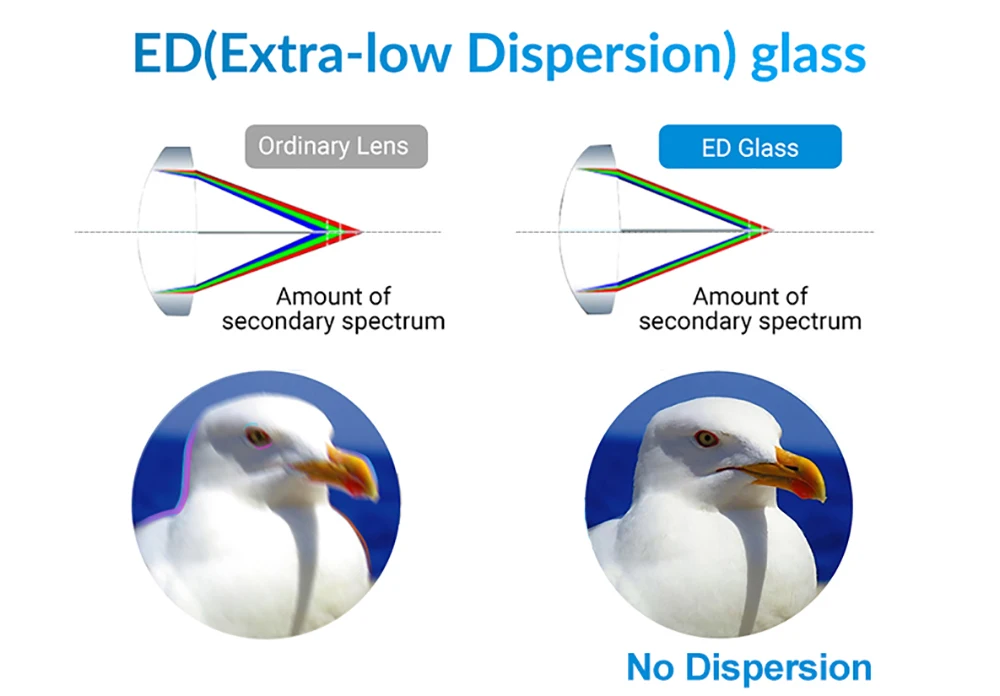 * El vidrio ED de dispersión extra baja reduce la aberración cromática que causa flecos de color y produce una imagen más limpia y brillante que los binoculares estándar.