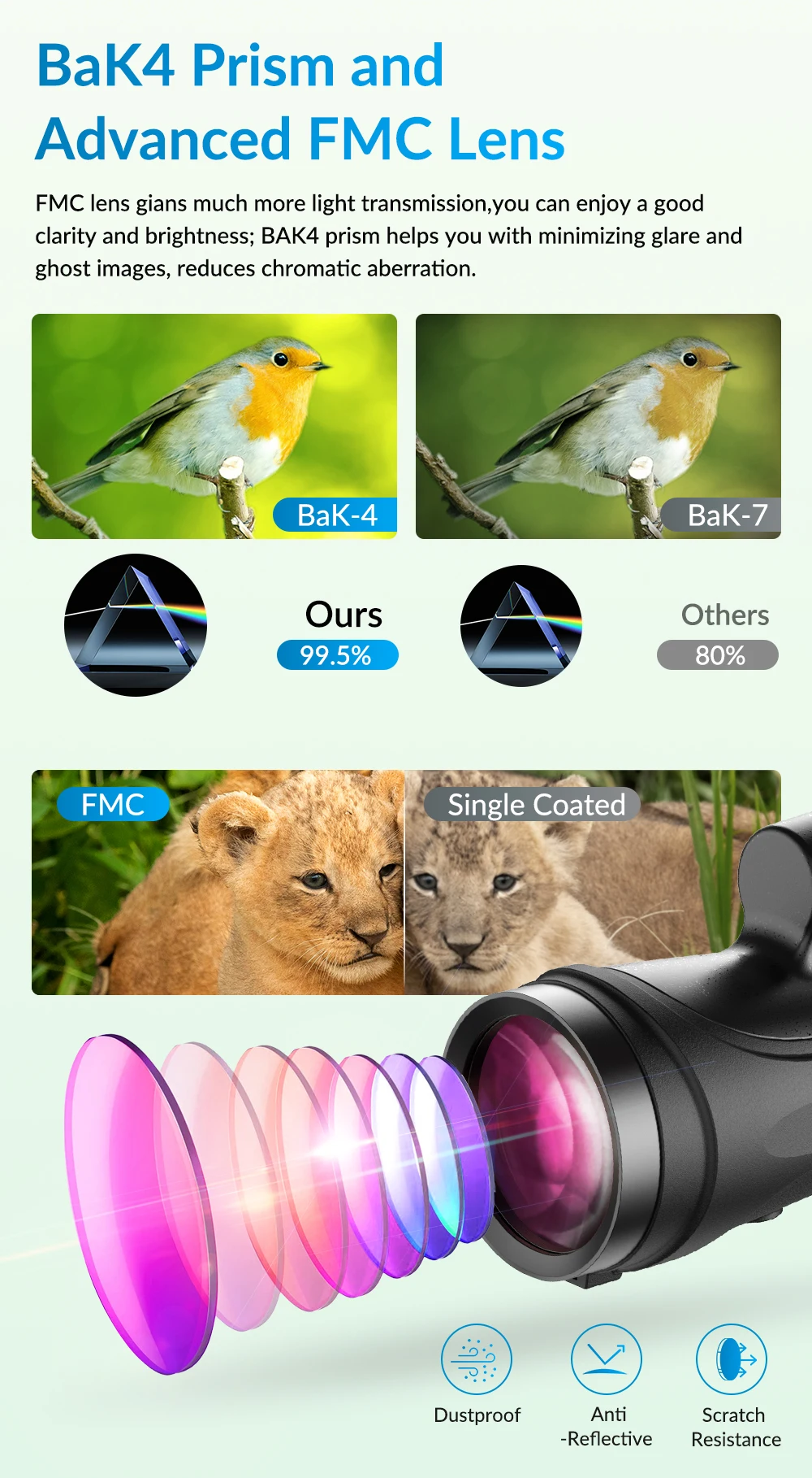 * Los recubrimientos corregidos de fase de prismas de alto índice de refracción producen imágenes nítidas, nítidas y de alta resolución, y las lentes multicapa proporcionan brillo y colores HD vívidos.