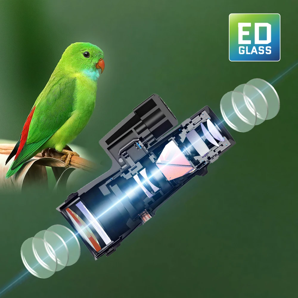 El vidrio ED (dispersión extra baja) está construido en el monocular APEXEL 12x50. El cristal ED minimiza los efectos del espectro secundario. En comparación con las lentes acromáticas, el cristal ED reduce la aberración cromática en un grado notable.