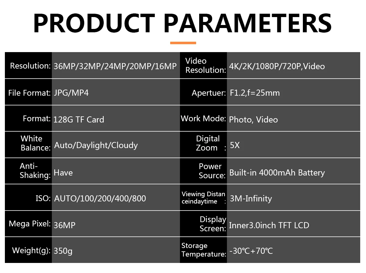 1. Resolución DE LA FOTO:36MP/32MP/30MP/24MP/20MP/16MP/12MP/10MP/8MP/5MP/3MP/VGA