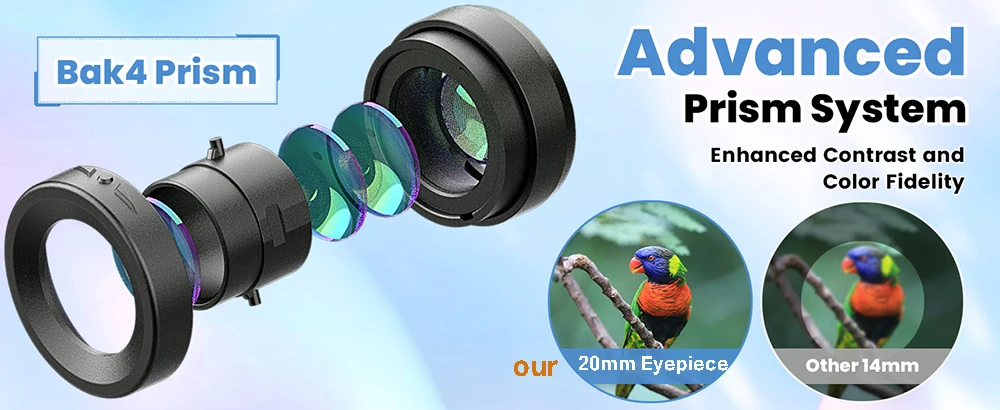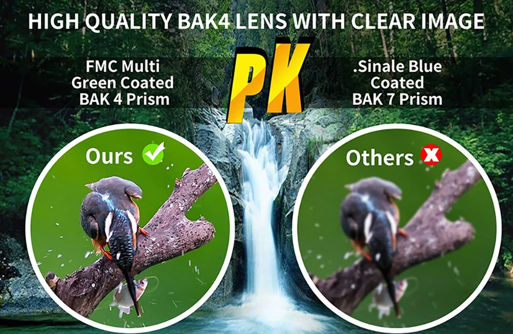【TECNOLOGÍA DE RECUBRIMIENTO DE BANDA TRANSPORTE FMC】 Los binoculares de crucero livianos están cubiertos con una textura de prisma BAK4.La lente del objetivo utiliza una película verde de banda ancha multicapa FMC óptica y el ocular óptico está hecho de un revestimiento FMC azul.Todo el diseño garantiza proporcionar una buena imagen y brindarle una experiencia increíble.