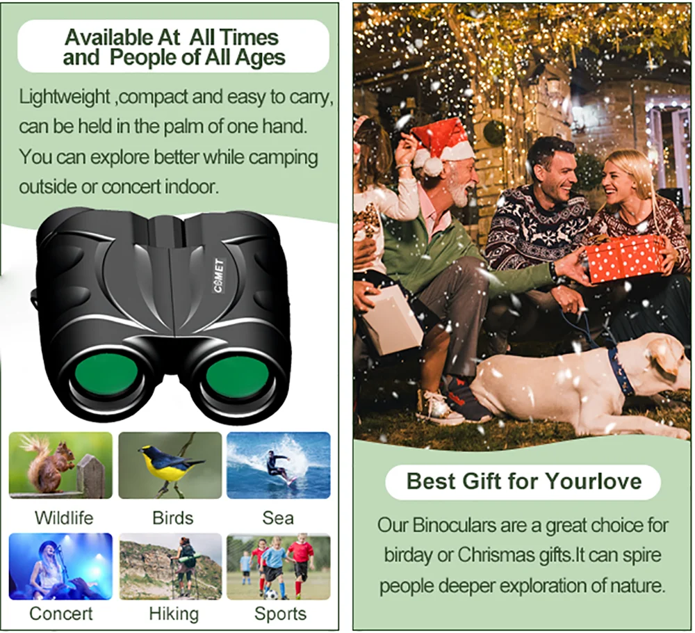 【DISEÑO BINOCULARES PORTÁTILES, COMPACTO Y PEQUEÑOS】 Se puede dominar una mano cuando usa los binoculares de observación de aves para ópera, observación de aves para acampar, viajar, observación de vida silvestre, juegos de fútbol, cruceros u otras actividades al aire libre, las gafas de visión nocturna con poca luz ( No para una noche completamente oscura) es más conveniente para usar y transportar.