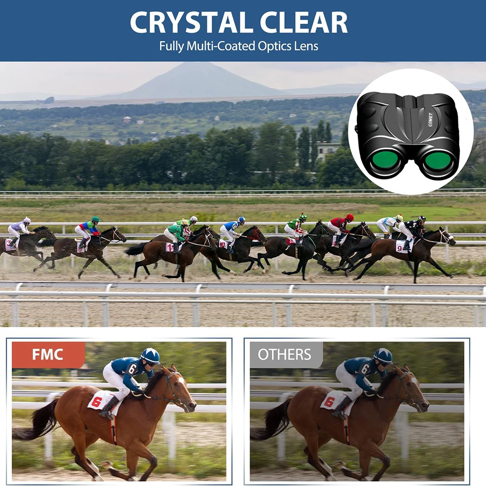 Las cubiertas para ojos ajustables se adaptan a usuarios de gafas o no: las cubiertas se pueden bajar los oculares de goma y se adaptan mejor al usuario de gafas, acercándose a las lentes y verlas fácilmente.El alivio ocular largo combinado con un ocular grande le brinda una visualización cómoda mientras usa gafas de sol o gafas.Para aquellos que no usan gafas, obtendrán un poco más enfocados y se sentirán más cómodos a través de los oculares subiendo.Los binoculares compactos tienen oculares grandes de 20 mm que pueden ver una imagen más clara que otros binoculares de viaje.