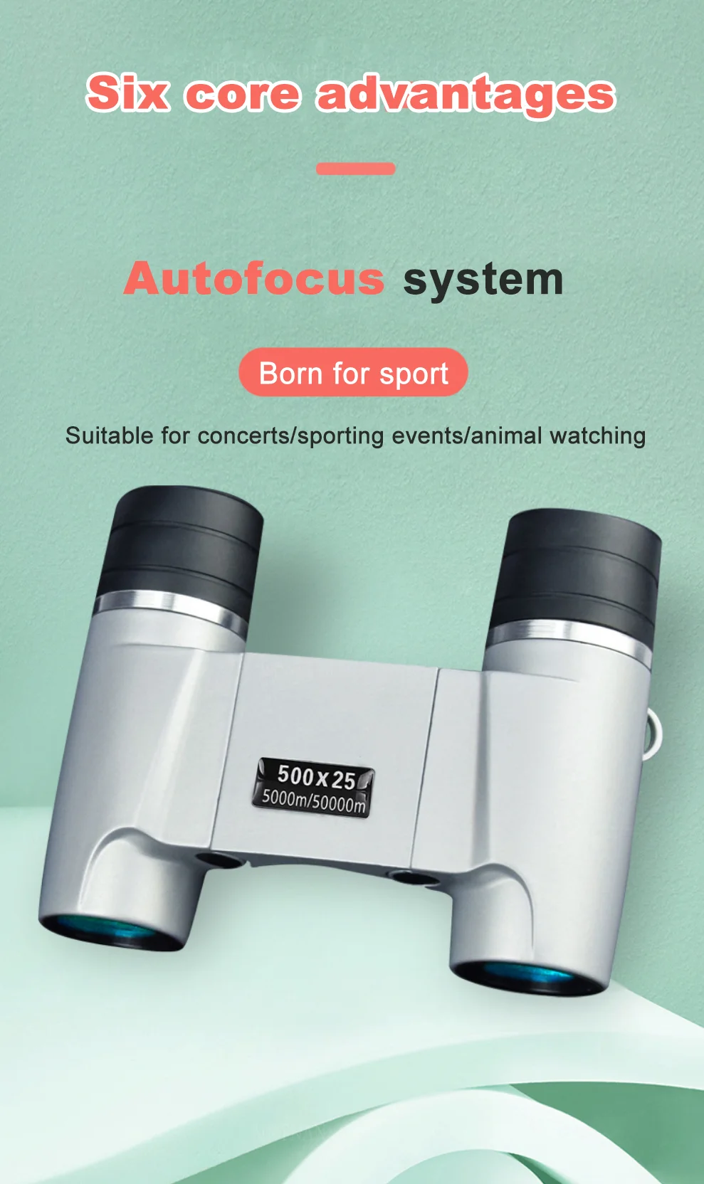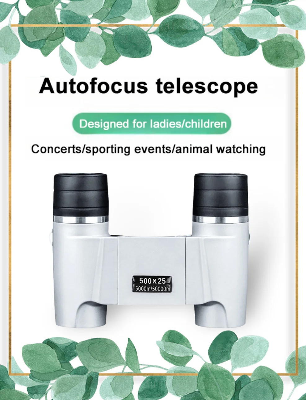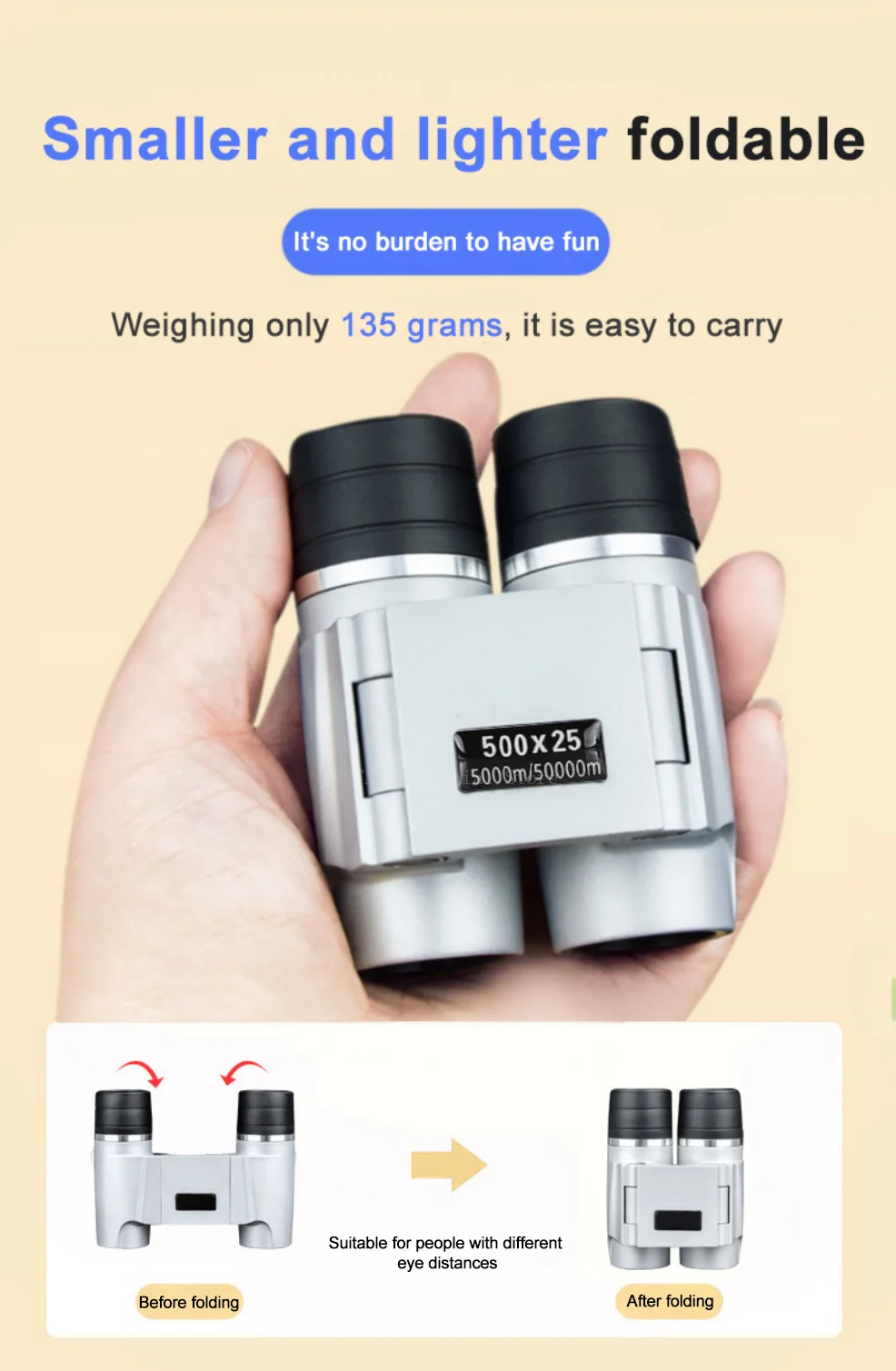 Modelo: 500x25 Material: Caucho y metal Material del prisma: BAK4 Revestimiento de la lente: Ocular de película azul, Lente objetivo de película verde Campo de visión: 500 M/50000 M Tamaño: 9 * 10,5 * 4 cm Paquete: 1 pieza