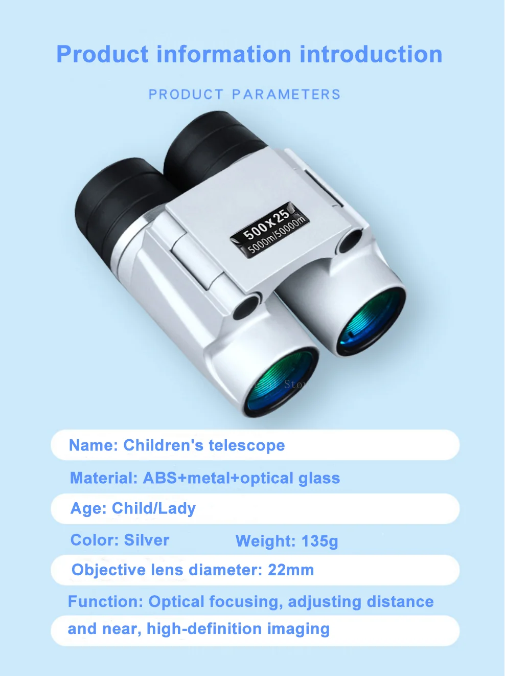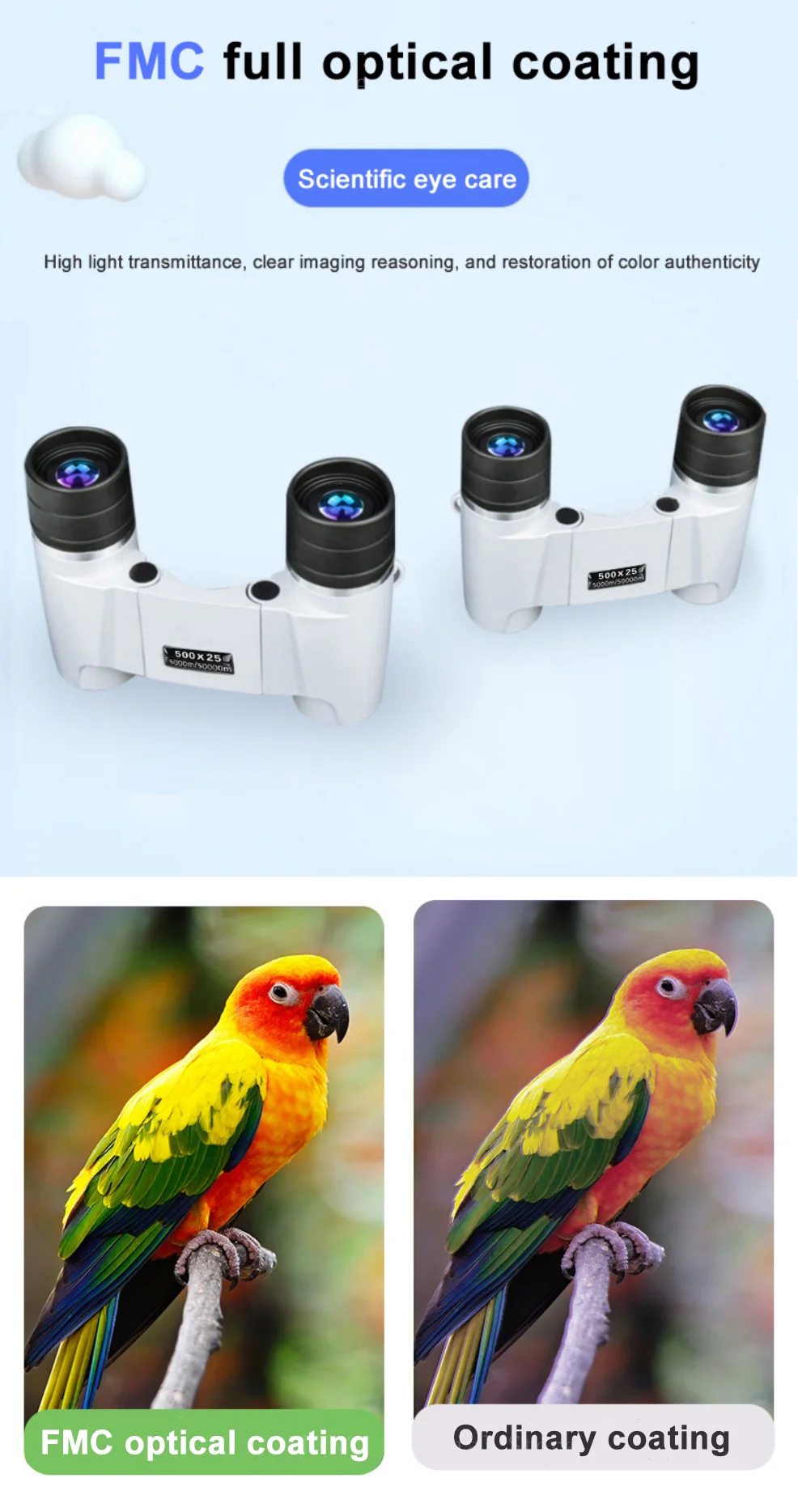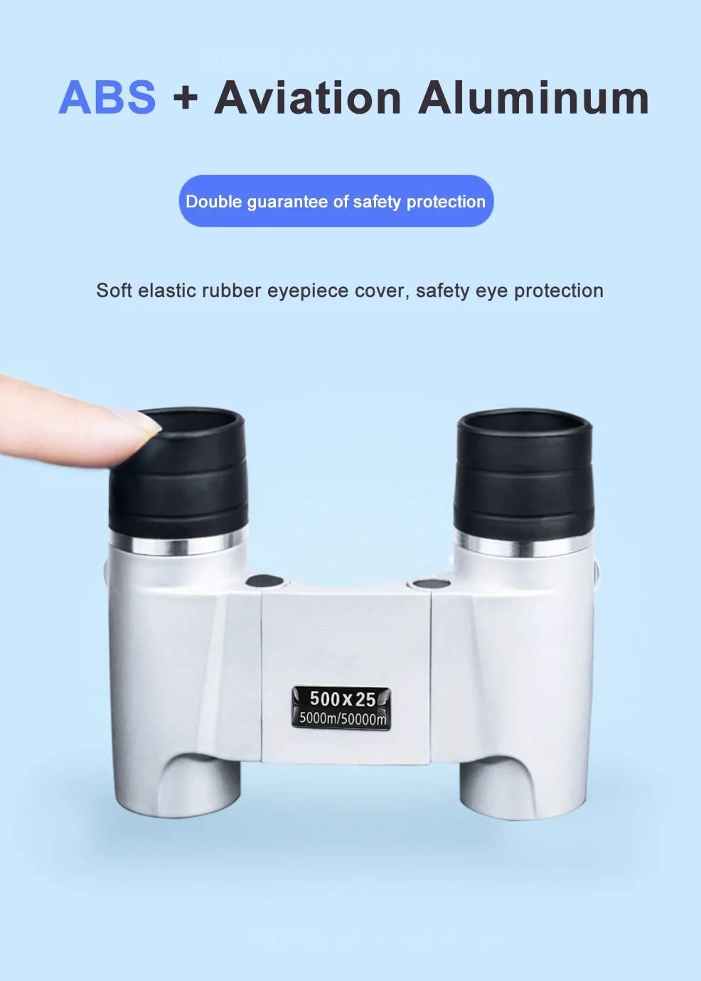 Modelo: 500x25 Material: Caucho y metal Material del prisma: BAK4 Revestimiento de la lente: Ocular de película azul, Lente objetivo de película verde Campo de visión: 500 M/50000 M Tamaño: 9 * 10,5 * 4 cm Paquete: 1 pieza
