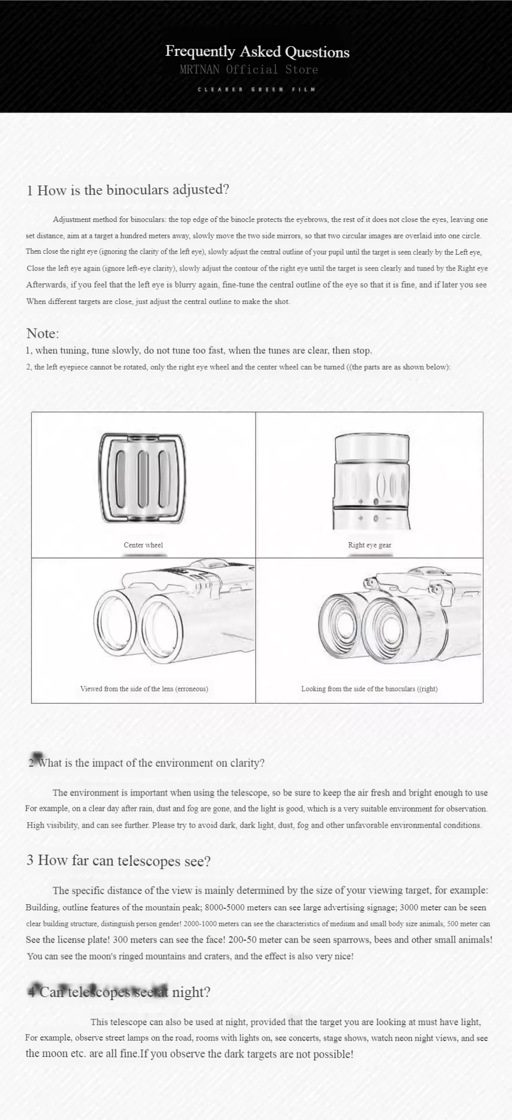 1.Mantenga una distancia adecuada de la pupila de salida con el ocular.Si las pegatinas están demasiado cerca o demasiado lejos, sentirá sombras oscuras en el campo de visión al observarlas y no podrá obtener un círculo de visión completo.