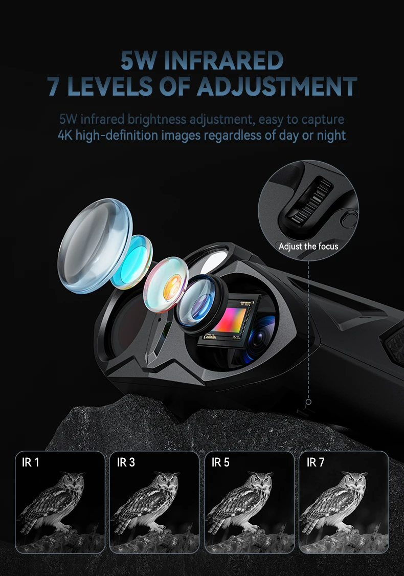 - Infrarrojos mejorados de 5 W para visión nocturna real: nuestros binoculares de visión nocturna 4K cuentan con una potente función de infrarrojos (IR) de 5 W con 7 niveles ajustables e iluminación infrarroja de 850 nm.Ajuste el enfoque y el zoom para obtener imágenes nítidas, incluso en total oscuridad.Perfecto para la caza y la observación de la vida silvestre, asegurando que su aventura nocturna nunca esté limitada por la oscuridad.