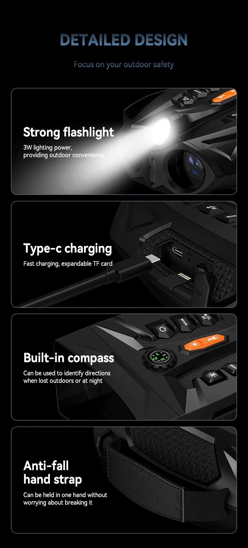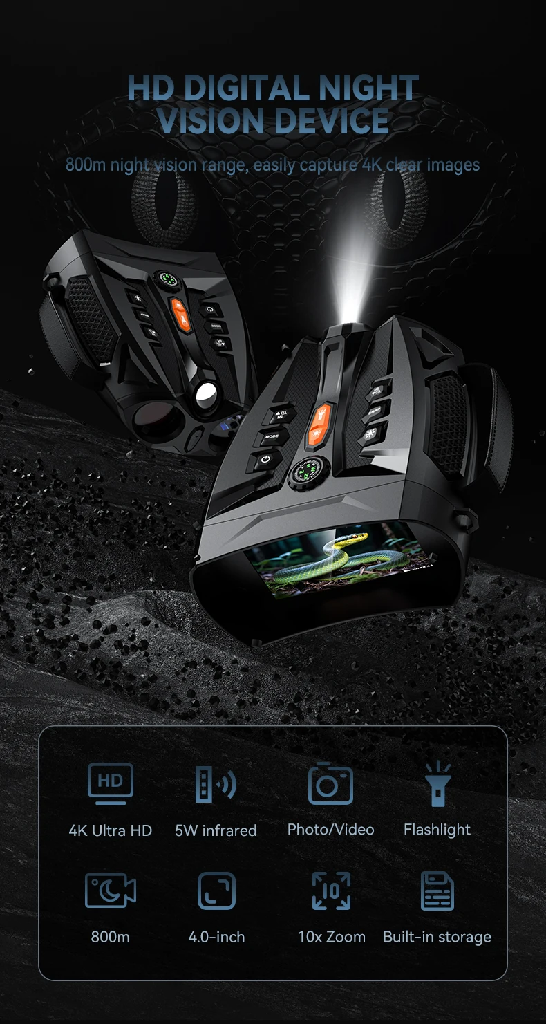 - Brújula incorporada para una fácil navegación: nuestros binoculares de visión nocturna digital 4K cuentan con una brújula incorporada, lo que garantiza que se mantenga en el camino en la naturaleza.Ya sea para cazar de noche por infrarrojos (IR) o aventuras al aire libre, estas gafas de visión nocturna brindan una navegación confiable en completa oscuridad.