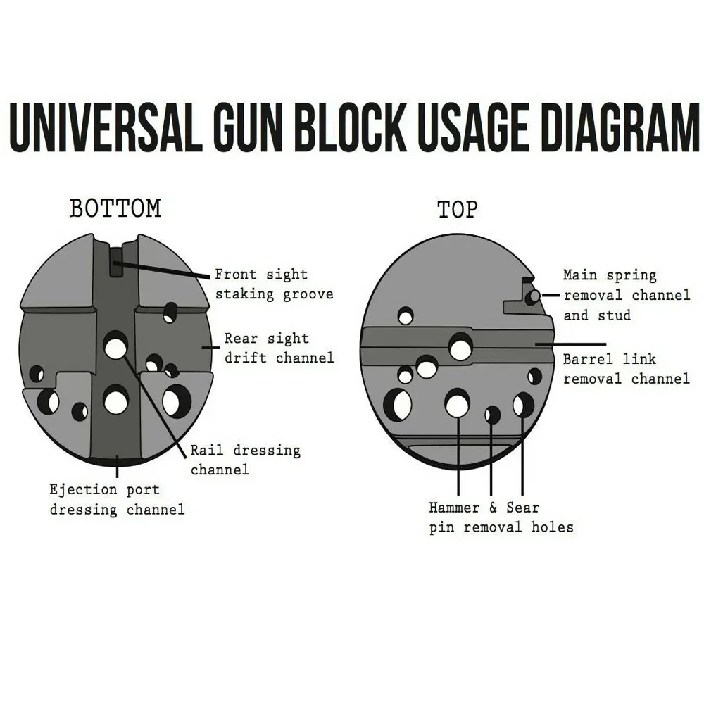 Canal de deriva de la mira trasera, canal de estafa de la mira delantera y orificios de extracción del martillo y del pasador de dorar