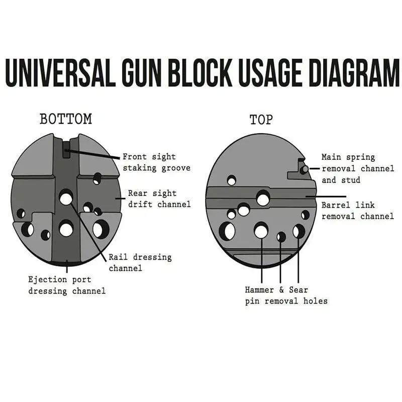 【Aplicación y uso】La ranura principal de extracción del resorte;la ranura de estaficación de la mira delantera;el canal de deriva de la mira trasera;el canal "V" de extracción del pasador del enlace del barril;los orificios de extracción del martillo y del pasador de dorar;la barandilla deslizante con un canal de fondo redondo;Canal de vendaje del puerto eyector.Muy útil para armería.