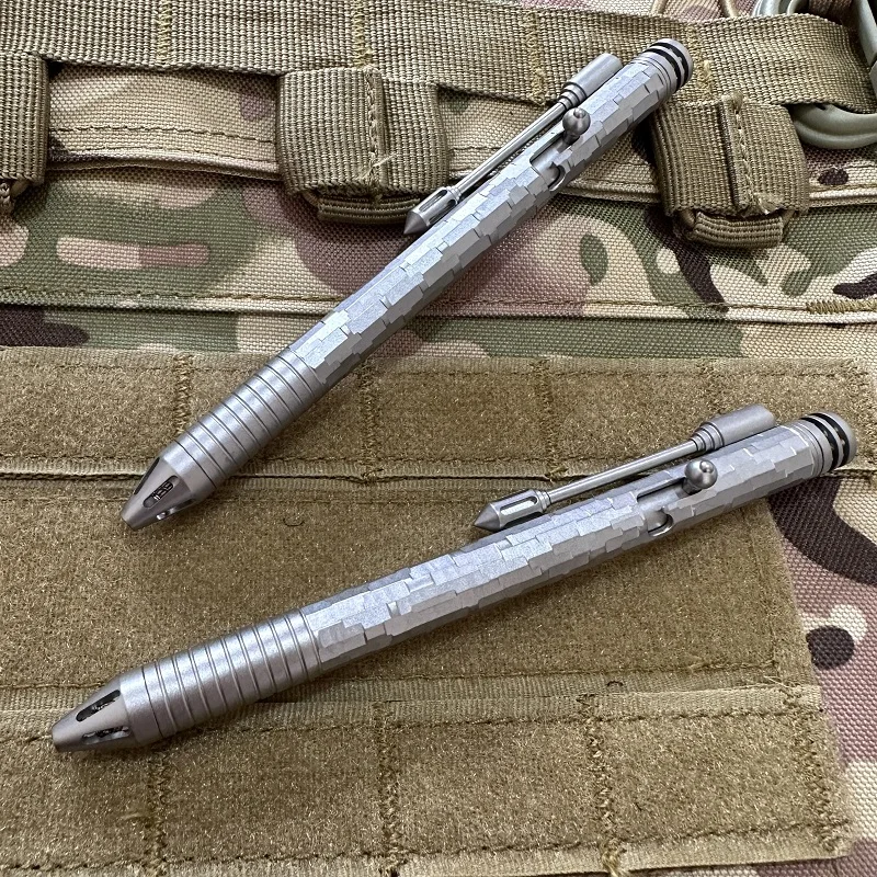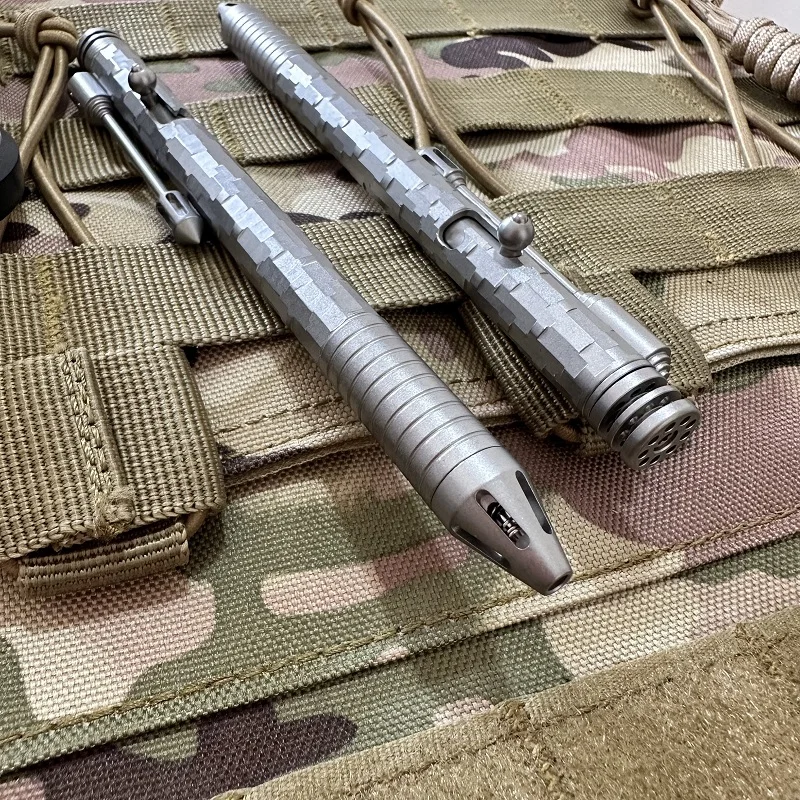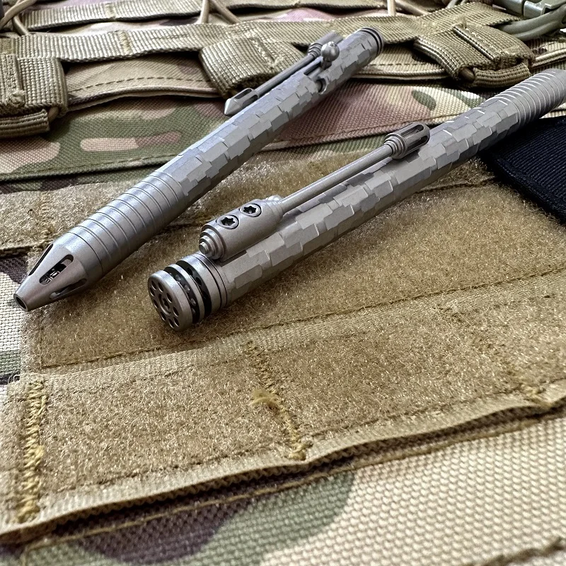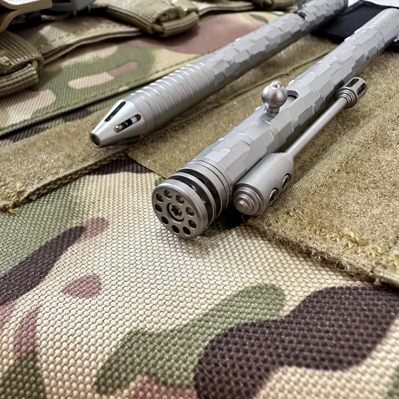 Material: aleación de titanio CT4 (excepto que el muelle del bolígrafo es de titanio) Tamaño: Longitud total 14,5 CM, diámetro del bolígrafo 1,1 CM (con abrazadera trasera 1,7 CM) Peso: recarga del bolígrafo 39,9G: recambio de bolígrafo Schneider G2 0,5mm a base de agua (disponible en el mercado recambio de bolígrafo estándar G2) bolígrafo de titanio de piedra multifacética y portalápices modificado varias veces, Ranura de 21 orificios (Lámpara de tritio que brilla en la oscuridad de 1,5x6mm)