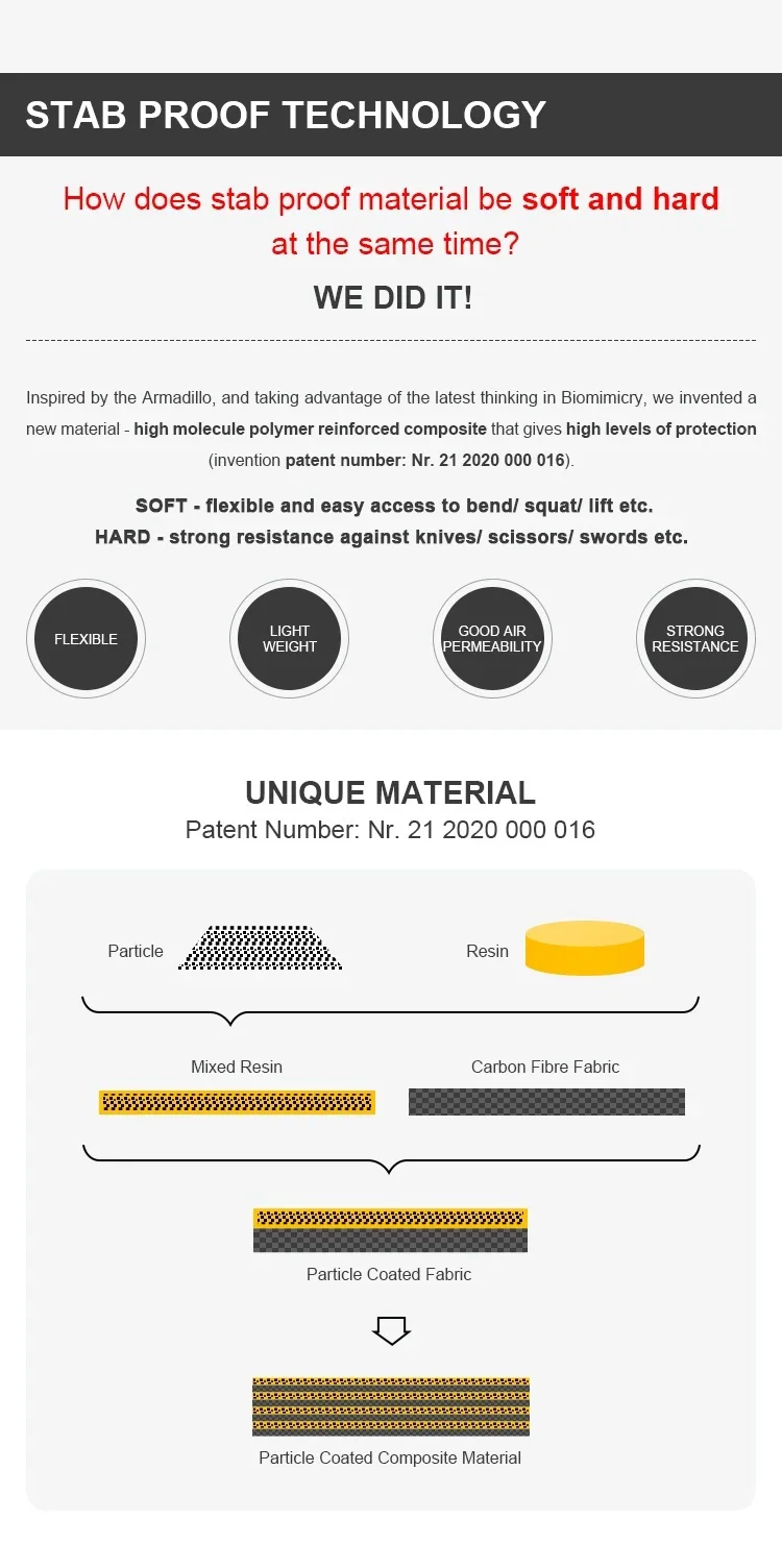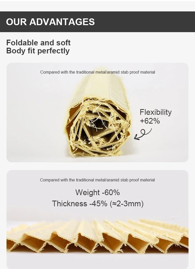 Las fibras de Saintfabric® están dispuestas aleatoriamente y entrelazadas para formar una estructura de red apretada e irregular, y luego las capas de la estructura de la red se superponen, por lo que el La punta de un cuchillo está unida y bloqueada por las capas de fibra durante el proceso de penetración, sin poder empujar todos los filamentos para penetrar suavemente en el cuerpo del usuario.