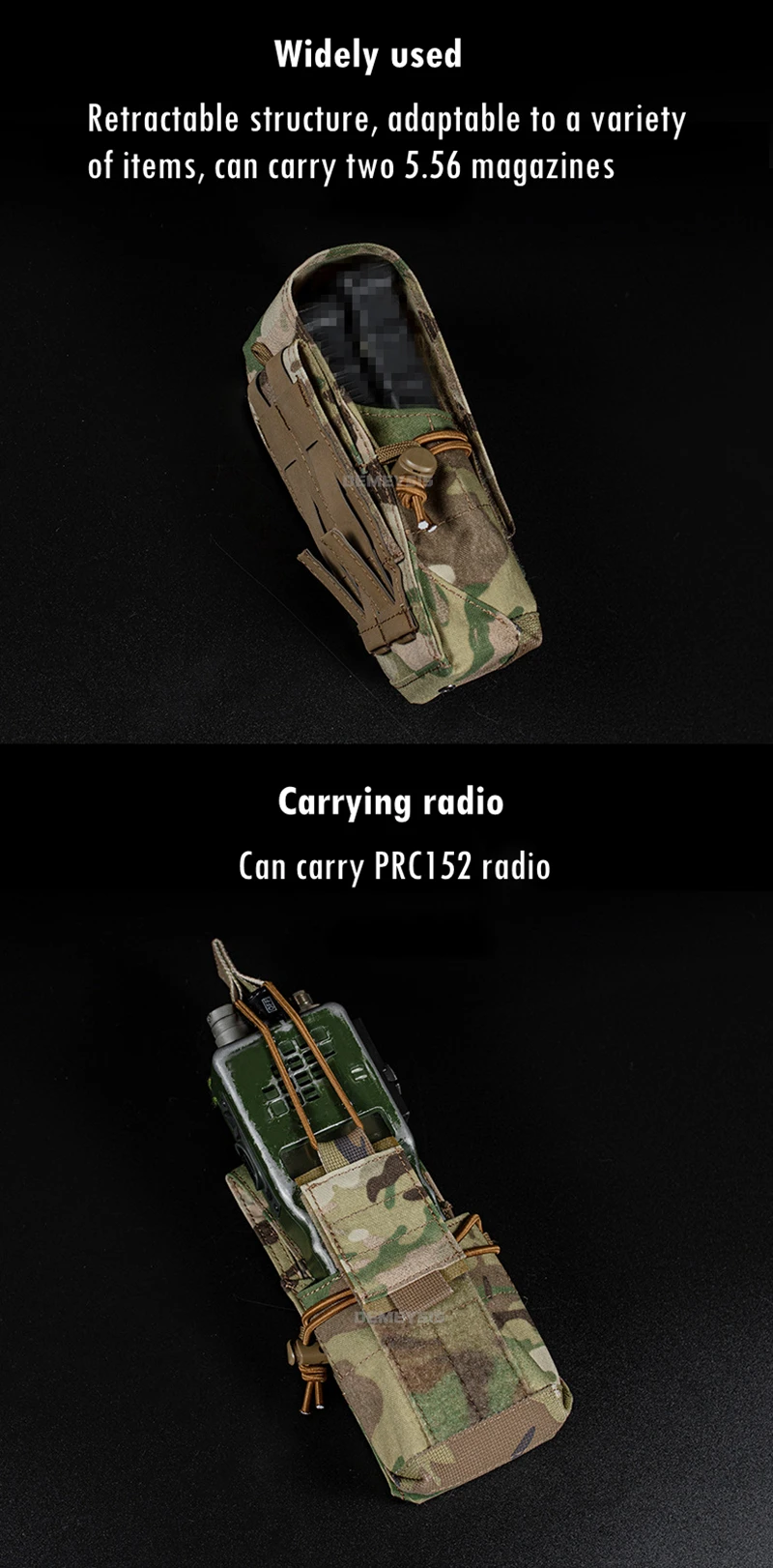 ●Estructura retráctil.Adaptable a una variedad de veces, puede transportar dos cargadores de 5,56.Se puede utilizar como bolsa de radio, puede llevar radio PRC152.