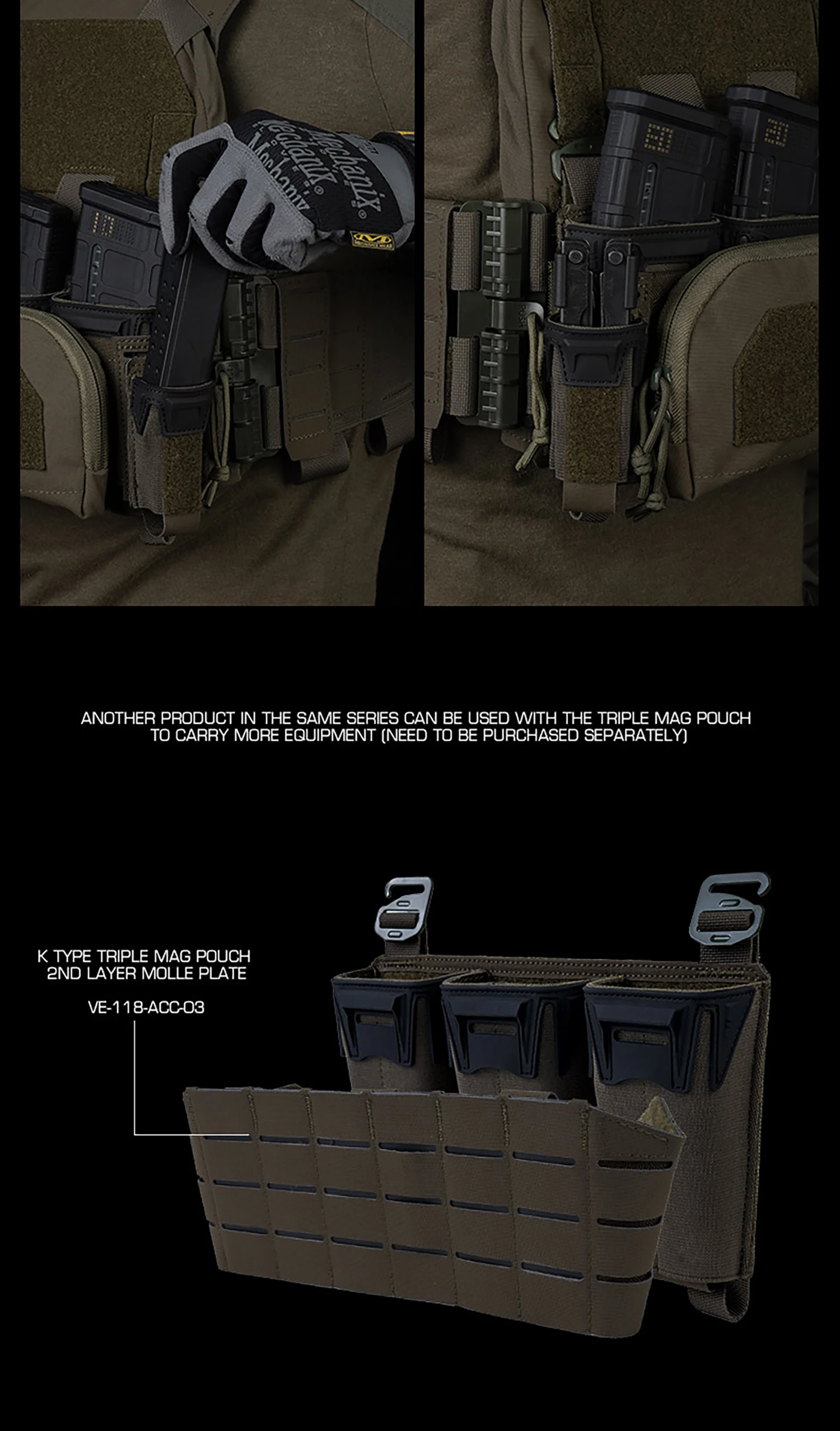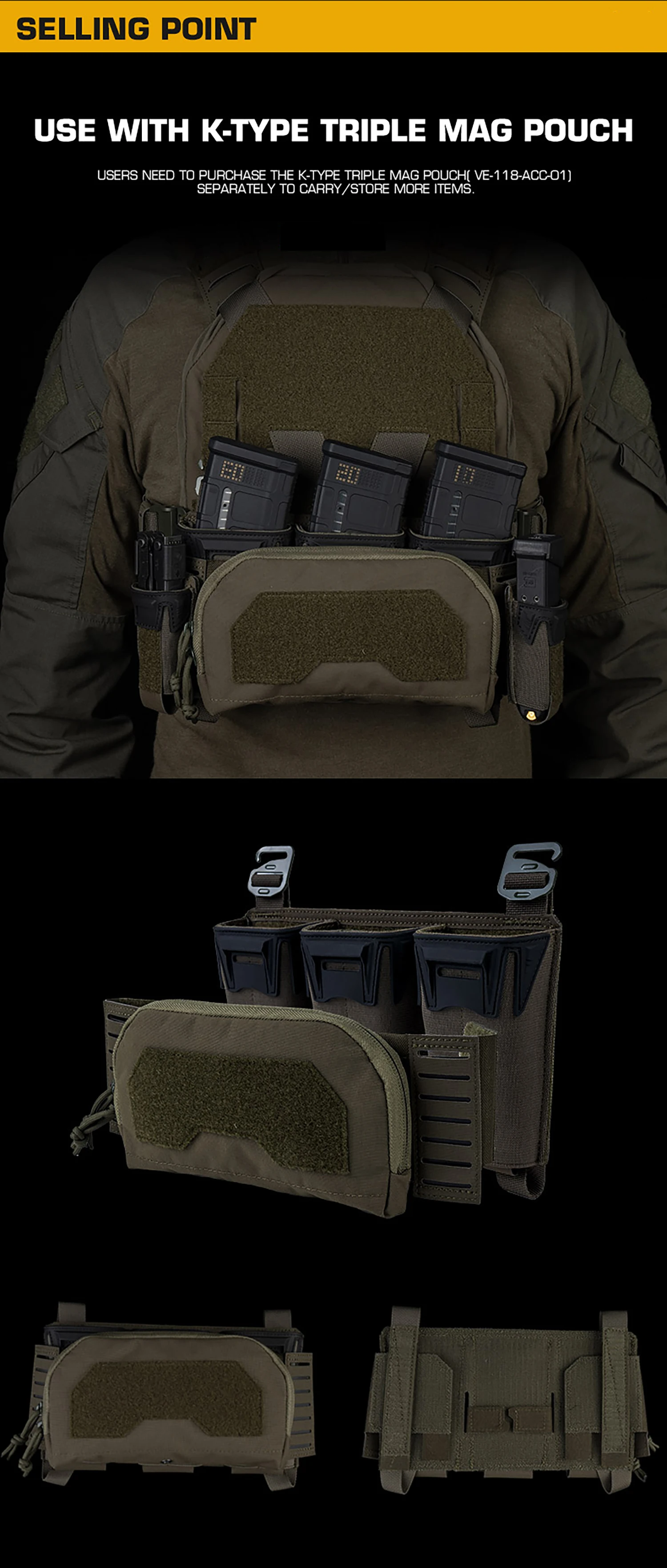 Integración definitiva del sistema modular: esta es la capa exterior de un sistema modular.Está diseñado para instalarse en la bolsa KZ Triple Mag (VE-118-ACC-01, que se vende por separado), creando un aparejo tórax en capas de alta capacidad que puede transportar revistas en la capa base y artículos de administrador en la capa exterior..