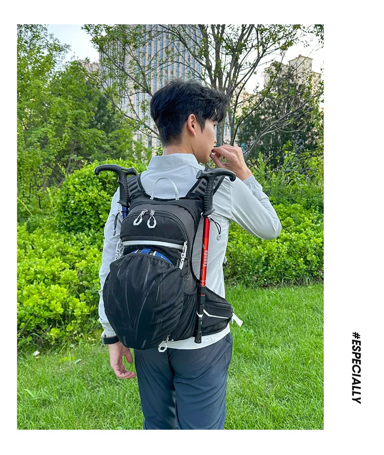 4. Colgador externo fijo para bastón de senderismo, correas elásticas laterales, puede fijar el bastón de senderismo, fácil de transportar.