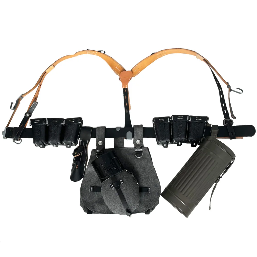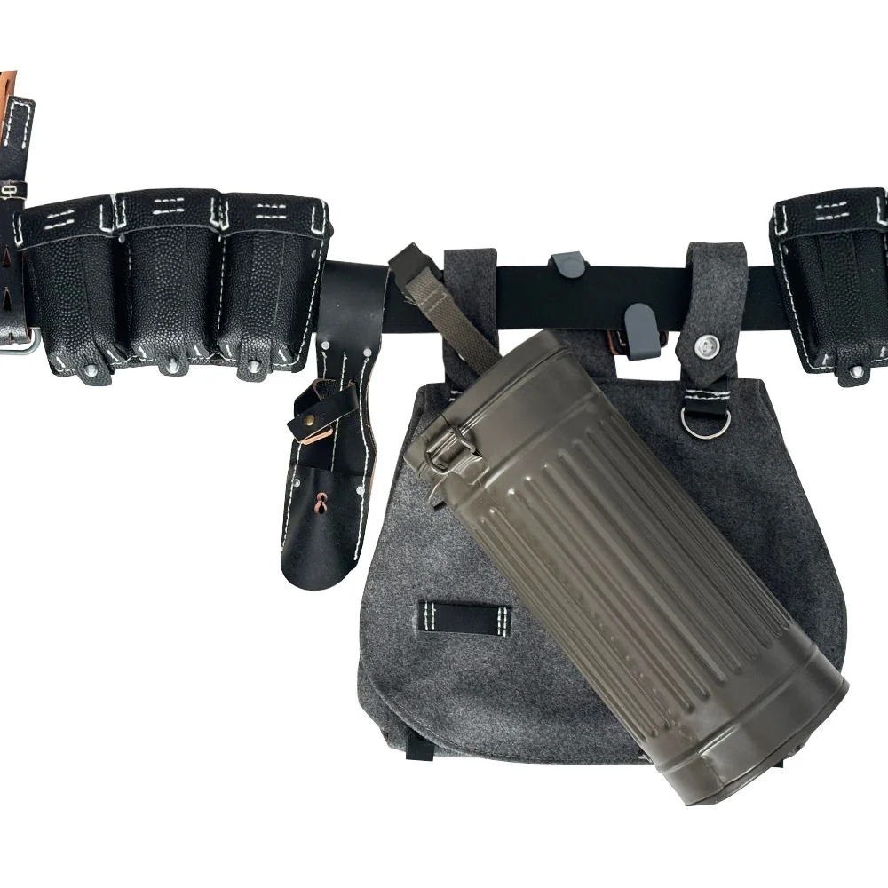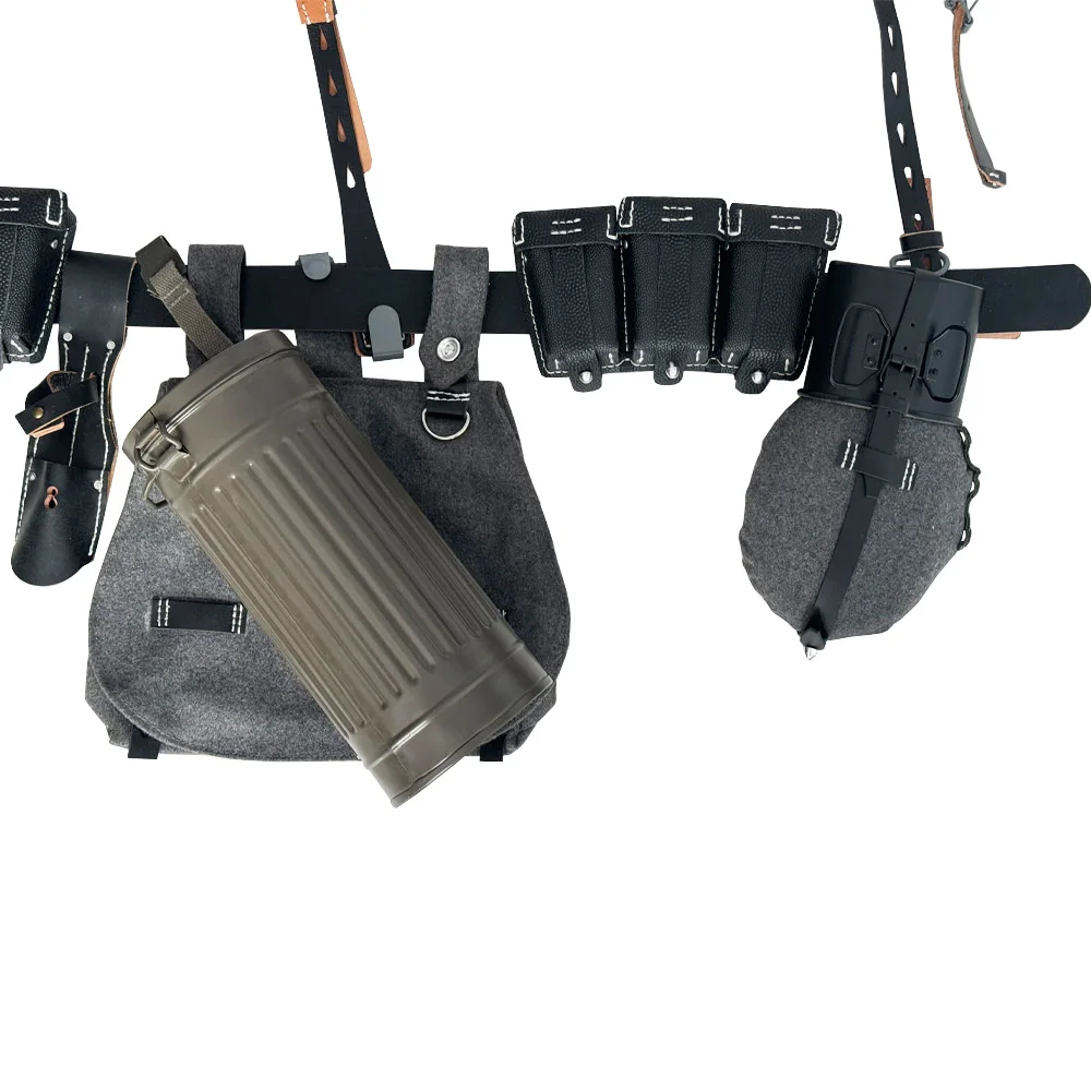 Esta combinación de equipos es una réplica de la combinación de equipos de soldados alemanes en la Segunda Guerra Mundial. El equipo general se copia del original y es muy similar al original. El material del cinturón del equipo es piel de vaca, que es muy cómodo y duradero. La bolsa para equipo es muy adecuada para su uso como objeto de colección o accesorio de equipo para actividades diarias.