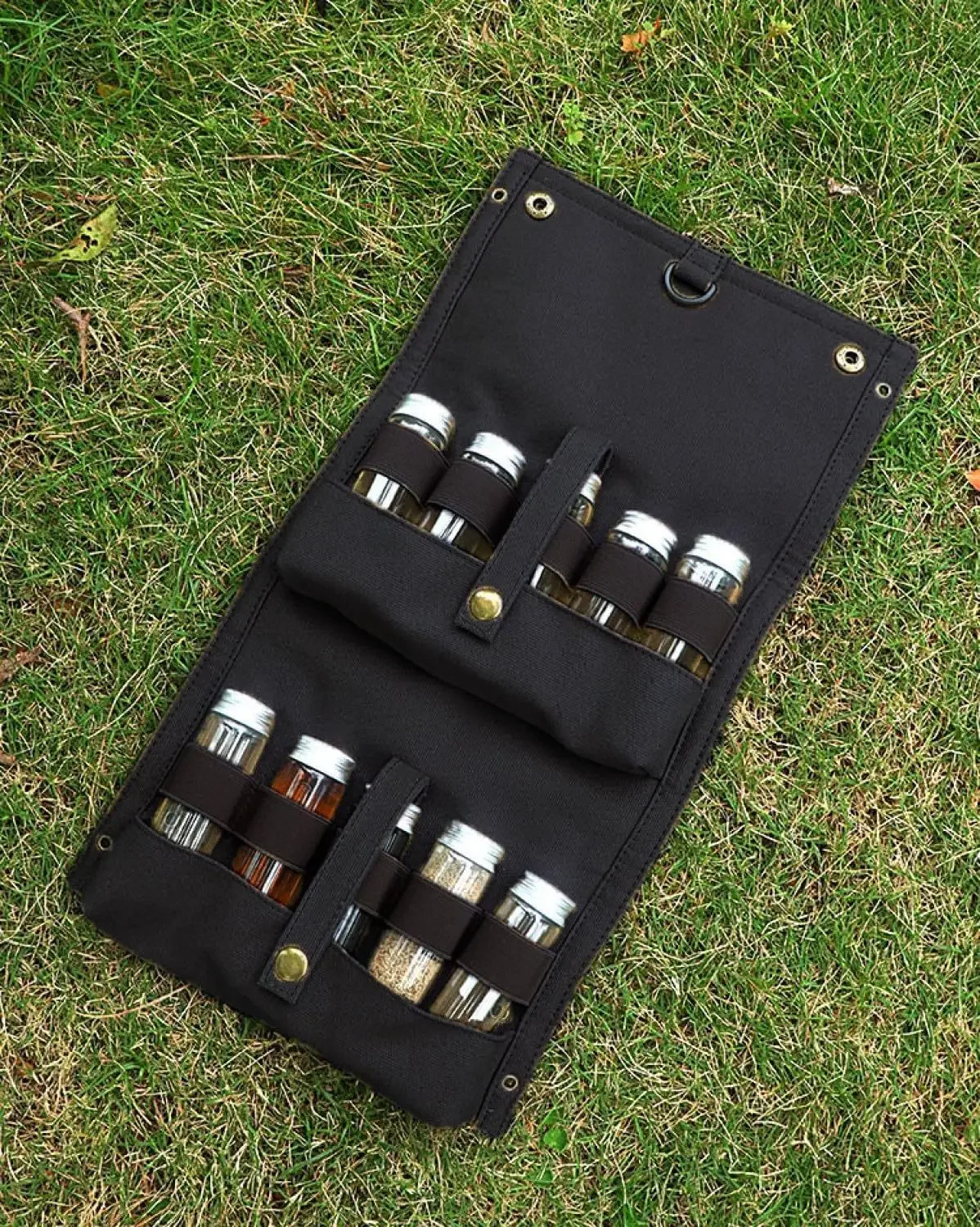 Diseño de 2 niveles con 10 bandas elásticas para mantener en orden los tarros de condimentos.
