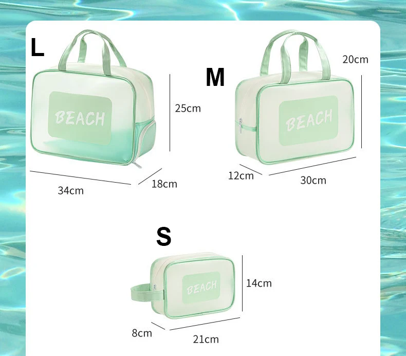 Material: PVC impermeable Tamaño L: 20 cm x 34 cm x 11cm(HxLxW) Tamaño M: 25cm x 33 cm x 18cm(HxLxW) Tamaño S: 25cm x 33 cm x 18cm(HxLxW) Uso: Bolso de mano multifuncional, bolsa de baño, bolsa de natación
