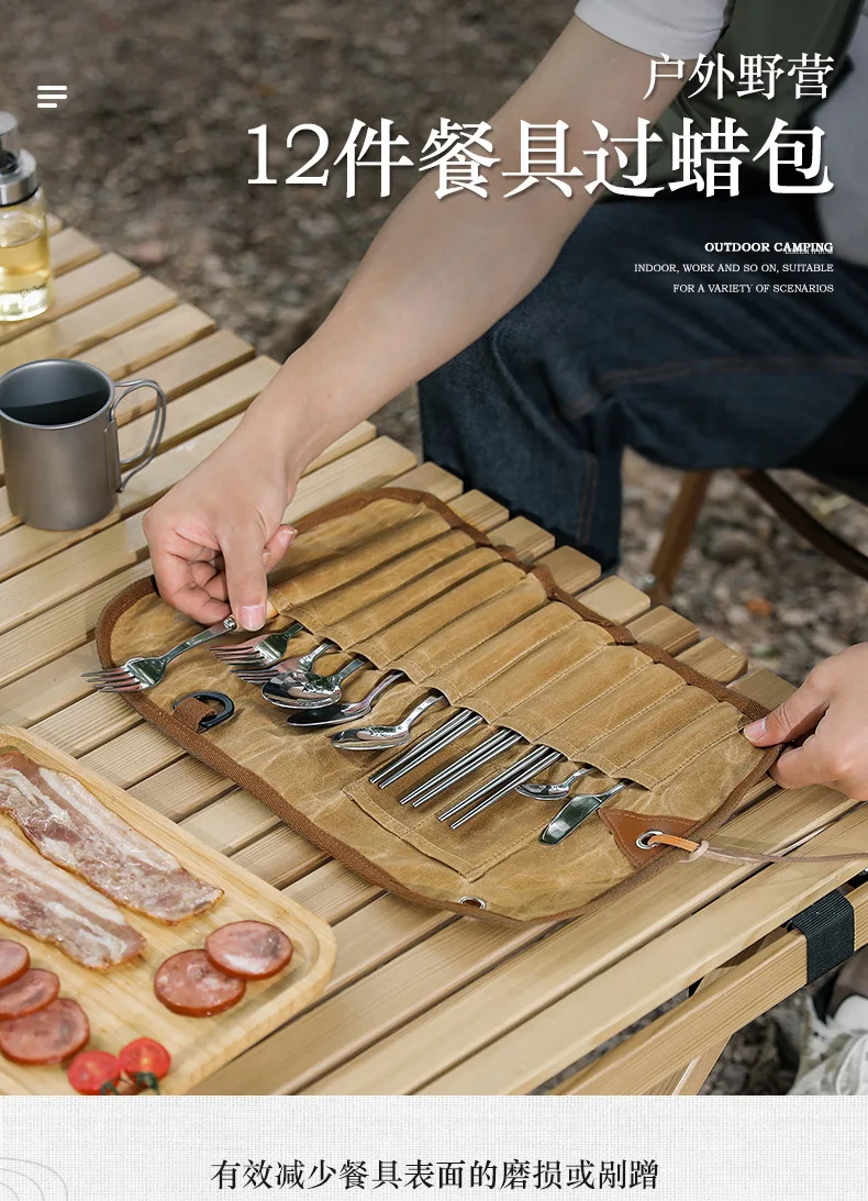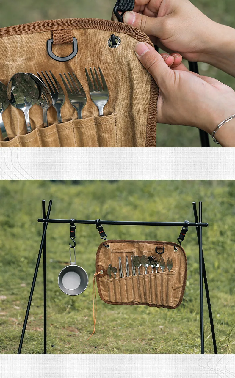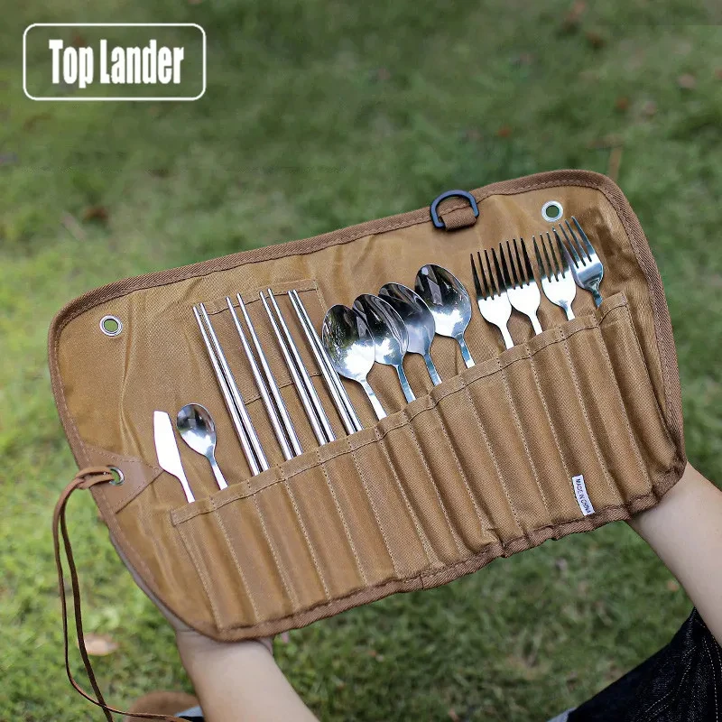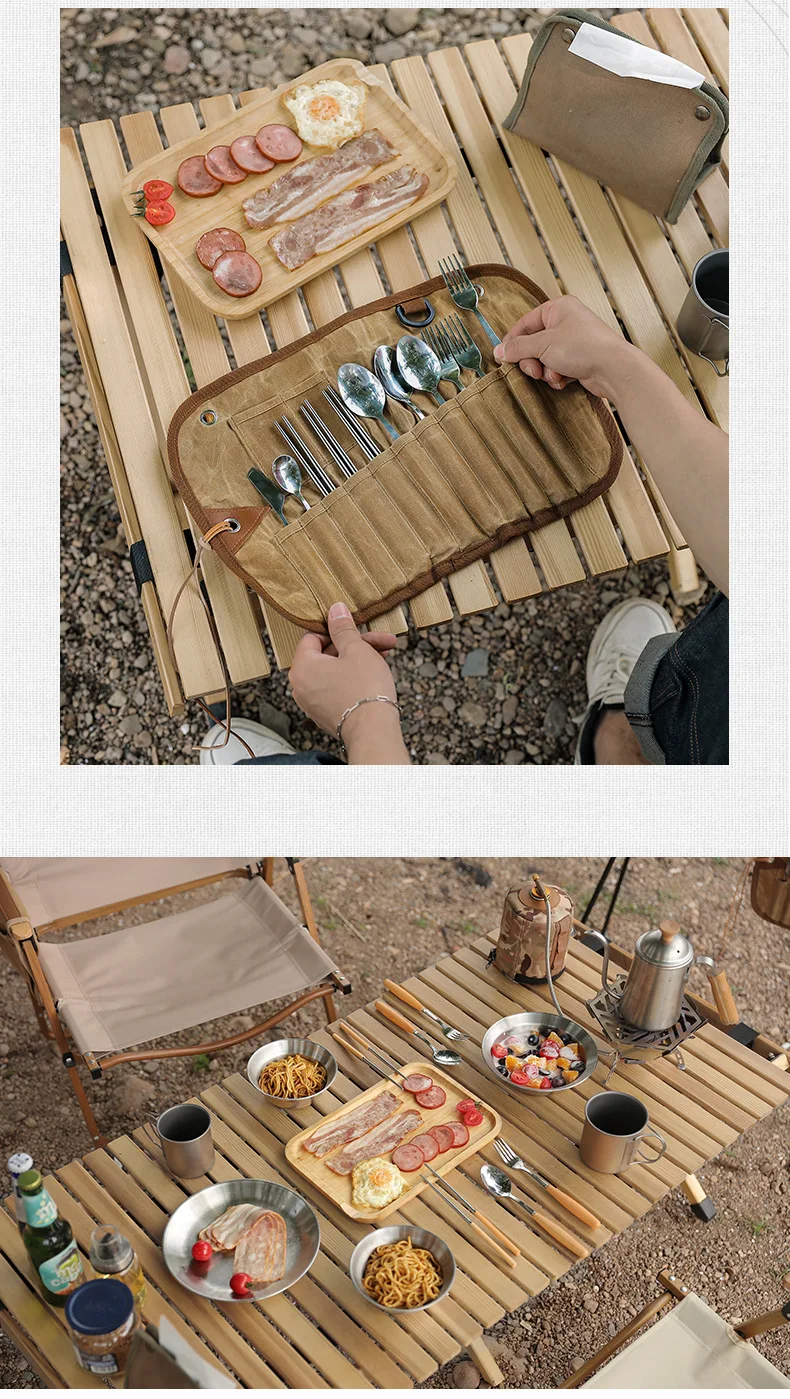 Bolsa de almacenamiento de lona para vajilla al aire libre, juego de vajilla de 3 y 4 personas, cuchara de acero inoxidable, palillos, tenedor para acampar, Picnic de viaje