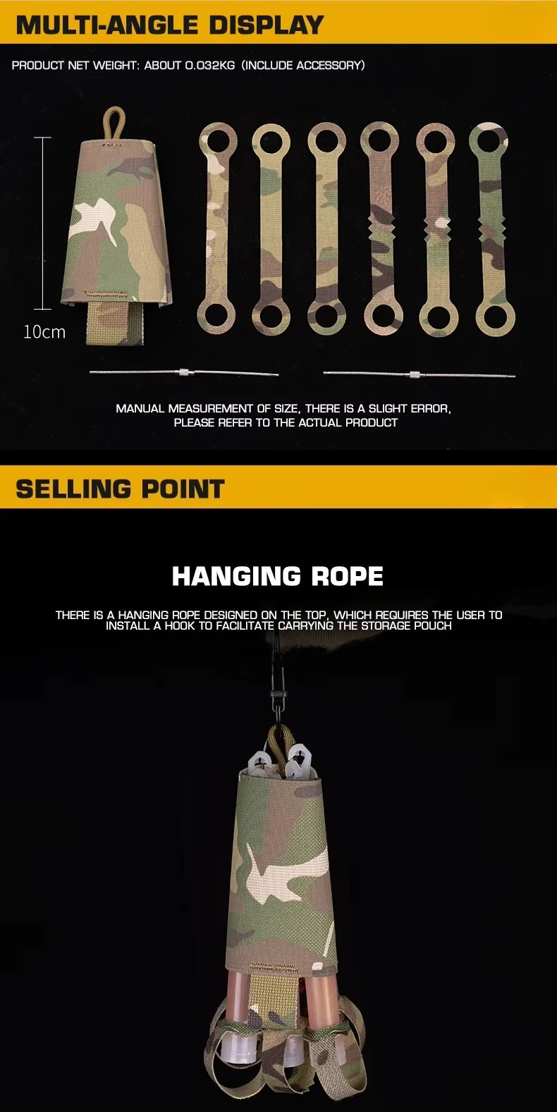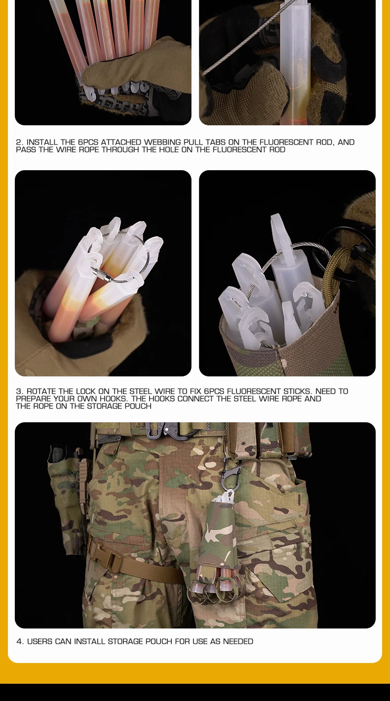 Descripción del producto Bolsa de almacenamiento de nailon para barra luminosa, ligera, con cuerda colgante para rescate nocturno, accesorios de caza Airsoft al aire libreInformación del producto Nombre del producto: Bolsa de almacenamiento para barra luminosa Número de artículo.: BP-131 Color del producto: BK/CB/RG/WG/MC/MCBK Escena aplicable: actividades en equipo, juegos CS, accesorios de películas.