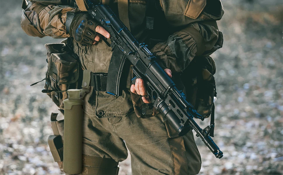 La bolsa de almacenamiento táctica se puede plegar y la tela de nailon se puede guardar dentro de la botella para ahorrar espacio cuando no esté en uso.