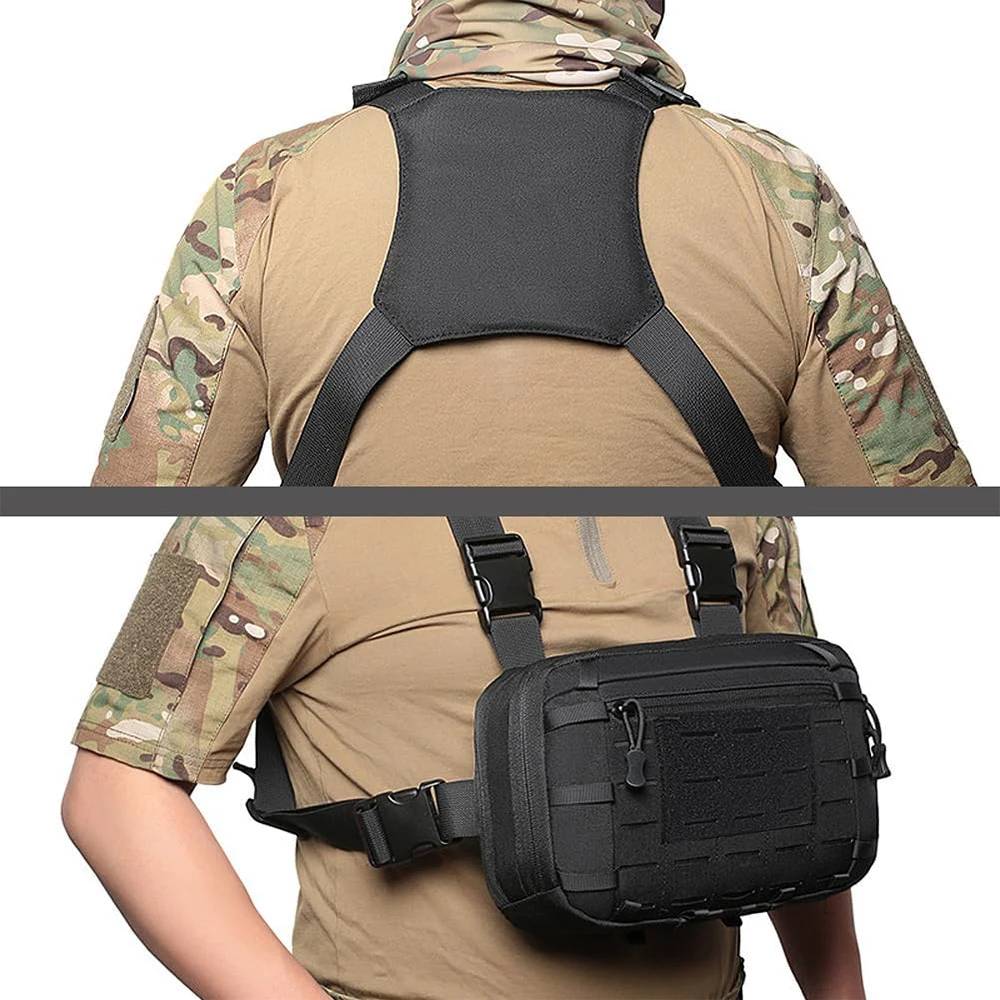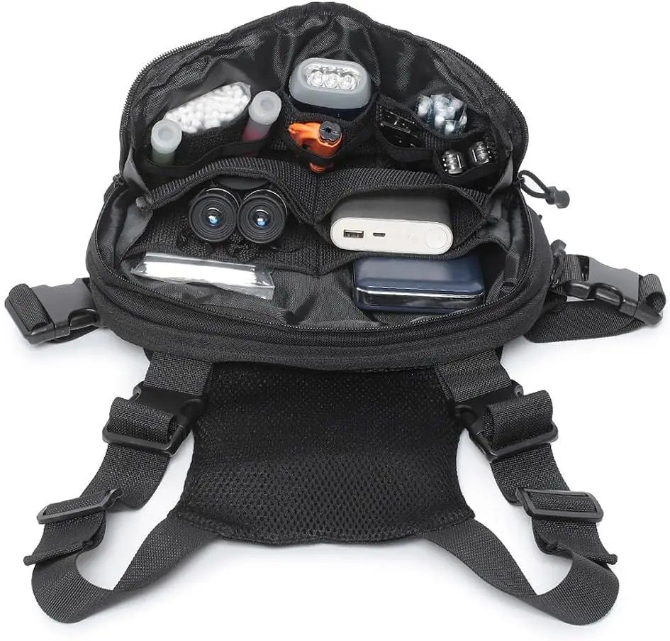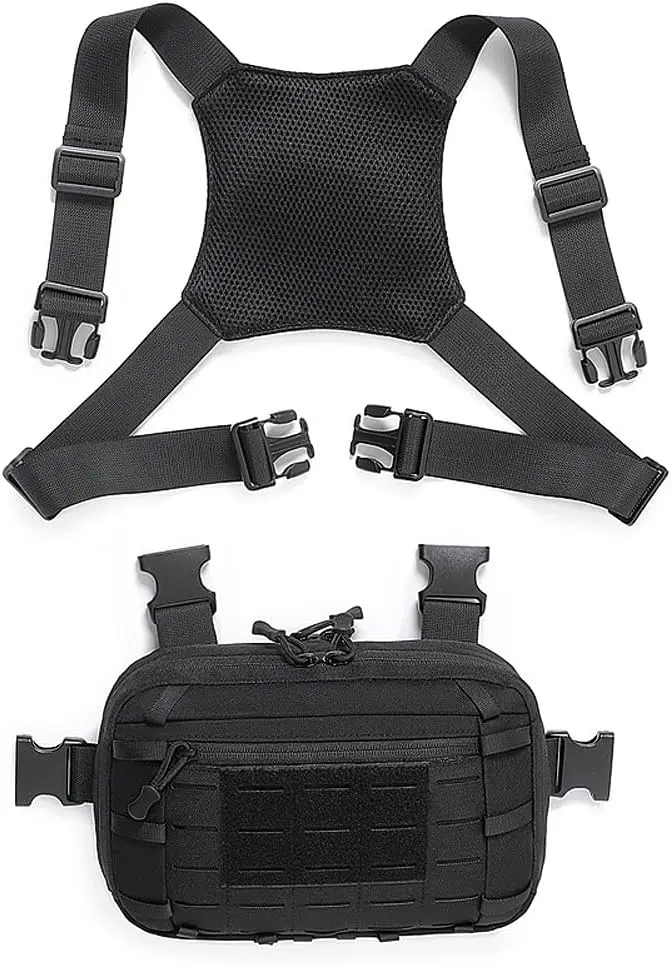 2. 【AMPLIO ESPACIO DE ALMACENAMIENTO】 Incluye un bolsillo frontal con cremallera, un bolsillo principal con cremallera y un bolsillo oculto para pistola.El bolsillo principal está dividido en 9 secciones con una partición de malla para organizar artículos EDC.El panel Molle permite herramientas adicionales y parches morales.3. 【SISTEMA DE CORREA PRÁCTICO】 Correas de hombro ajustables con cuatro hebillas de liberación rápida para facilitar su uso y extracción.La parte trasera del panel de malla garantiza comodidad y transpirabilidad, mientras que las correas de 1,5" de ancho reducen la presión de los hombros.4. 【MATERIALES DE ALTA CALIDAD】 Construido con nailon 600D duradero, esta mochila de pecho es liviana, resistente al desgaste, resistente al desgarro y al agua.Las cremalleras YKK de alta calidad proporcionan un funcionamiento suave sin atascos.5. 【APLICACIONES VERSÁTILES】 Perfecto para transportar pistolas, linternas, GPS, billeteras y otras herramientas EDC durante carreras urbanas o ciclismo.Ideal para actividades al aire libre como aventuras en la jungla, caza, senderismo, camping, escalada y pesca.El paquete incluye: