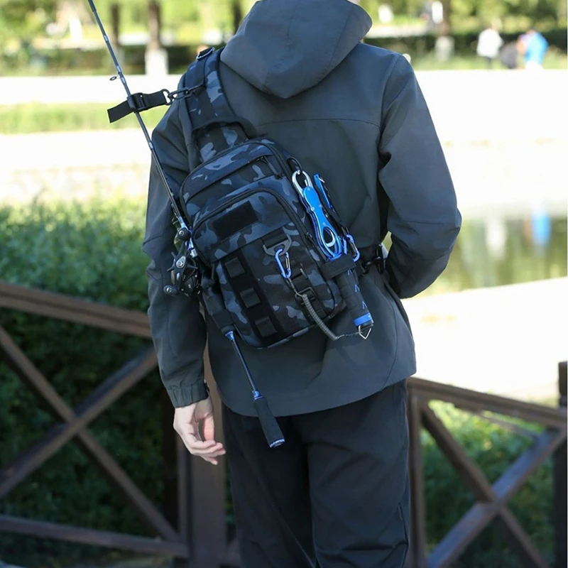 Bolso cruzado de camuflaje para el pecho, mochila de viaje de pesca de gran capacidad para almacenamiento de equipo de pesca