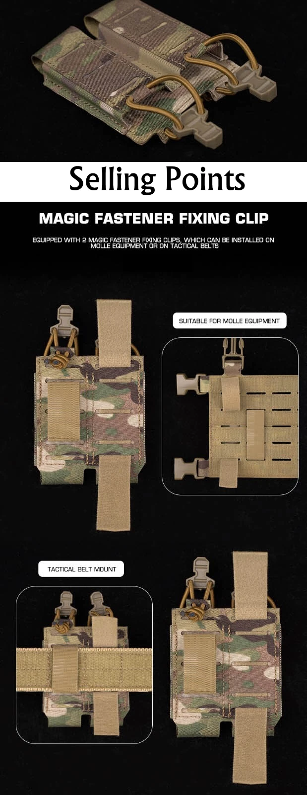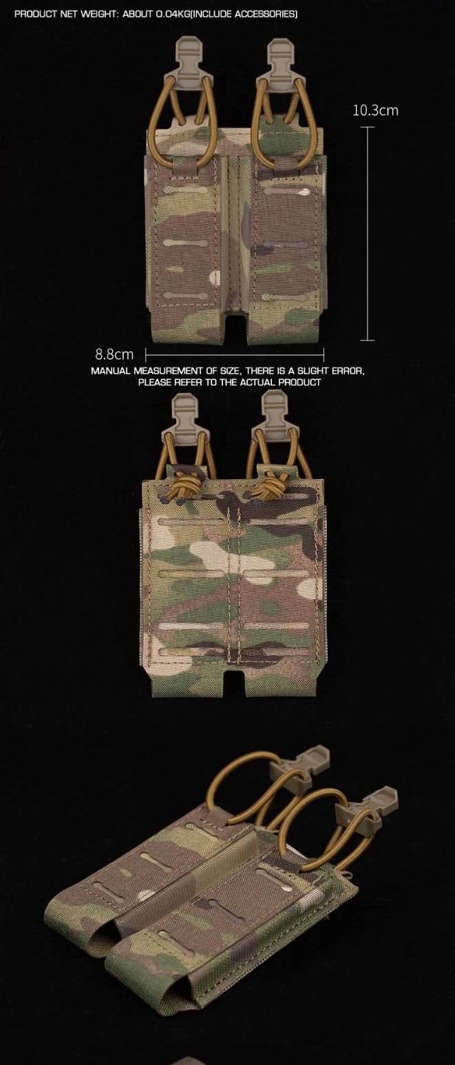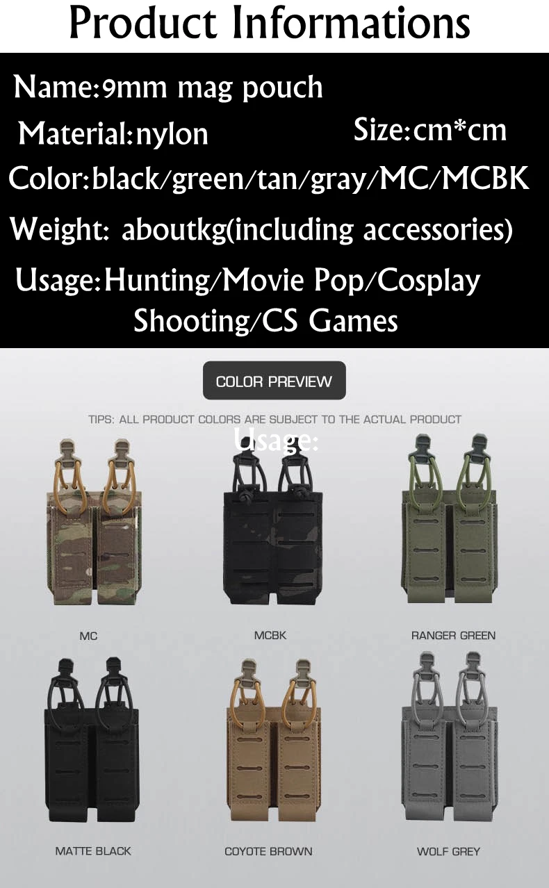 Características del producto: Nombre: Bolsa magnética simple/doble de 9 mm Color: negro/verde/tan//MC/MCBK Peso: alrededor de 0,04 kg Tamaño: 8,8 cm * 10,3 cm Material: NYLON Uso: caza Lista de paquetes: 1 Uds x bolsa