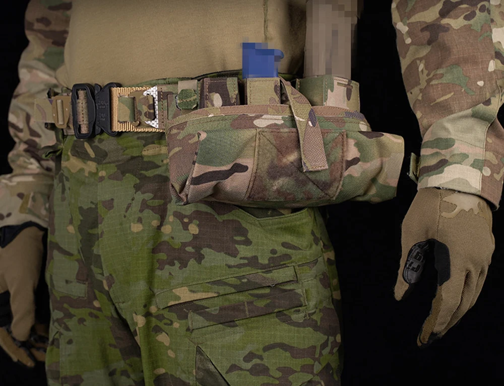 ② La bolsa táctica de descarga se ensancha en la parte superior para que se pueda colocar con varias fuentes de munición y bolsas de utilidad.