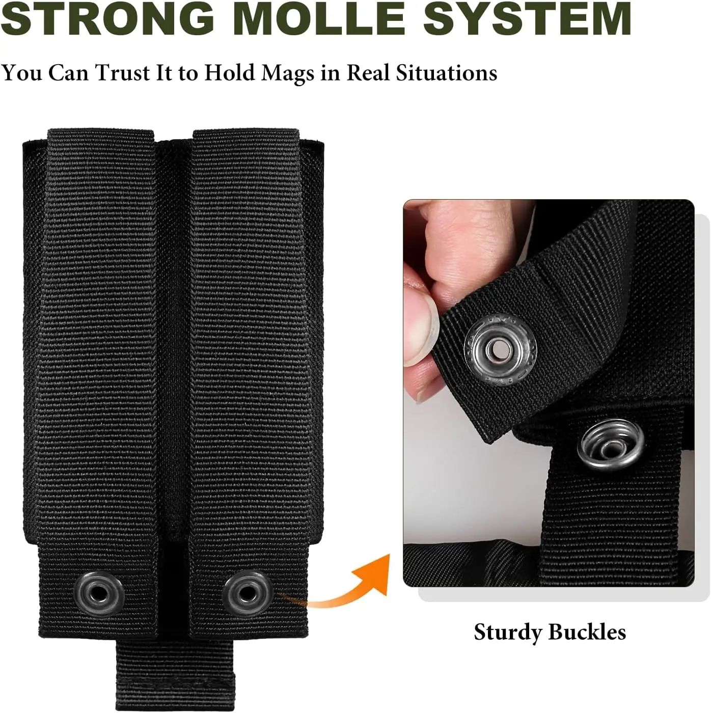 4.【Compacto y portátil】 El tamaño plegado es de solo 3,9 x 3,1 pulgadas y pesa solo alrededor de 60 g, lo que facilita su transporte.Nuestro sistema Molle está equipado con 2 clips resistentes y cordón, que pueden fijar de forma segura el producto a los cinturones/mochilas tácticos, chalecos tácticos con paneles MOLLE y otros cinturones de servicio, garantizando la seguridad durante el uso en escenarios especiales y evitando el riesgo de que el producto se caiga en emergencias.