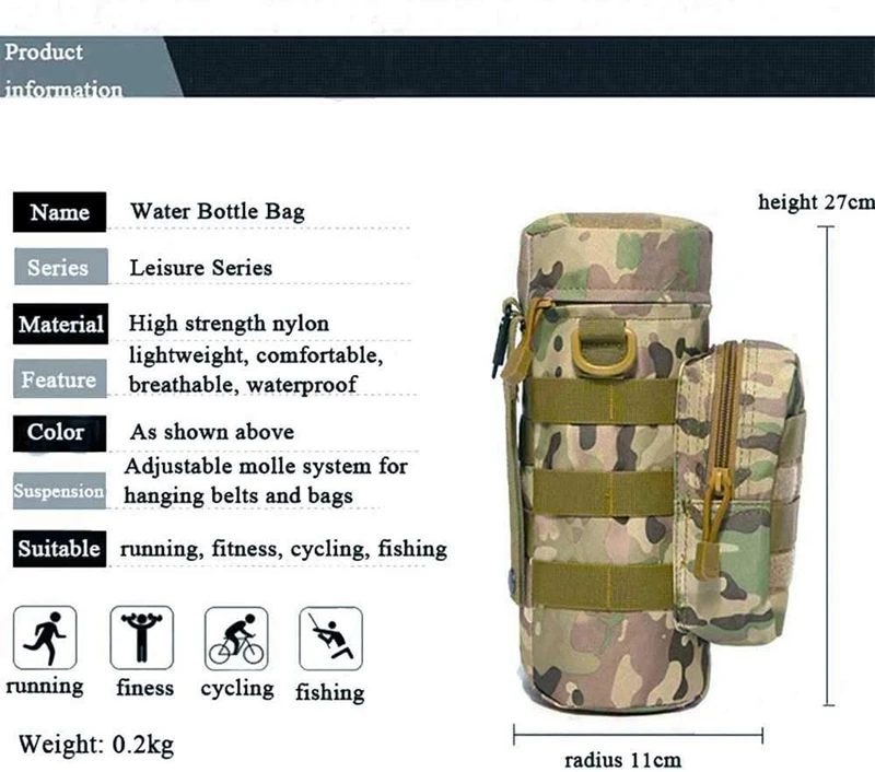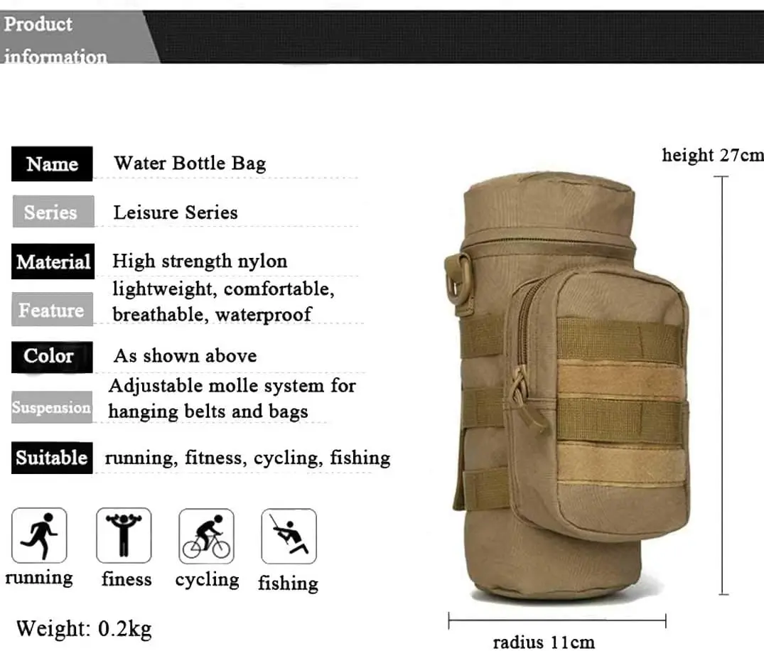 Gran capacidad: el tamaño de la bolsa de la botella de agua es de 11x4 pulgadas, puede ser de gran capacidad para poner artículos personales, bolsa de almacenamiento frontal con cremallera, puede poner teléfonos móviles, gafas de sol, cambio, llaves y otros artículos personales pequeños, la bolsa principal se puede poner en un paraguas plegable, Las bebidas y las herramientas pueden cumplir con el tamaño de las Teteras de la mayoría de las personas.