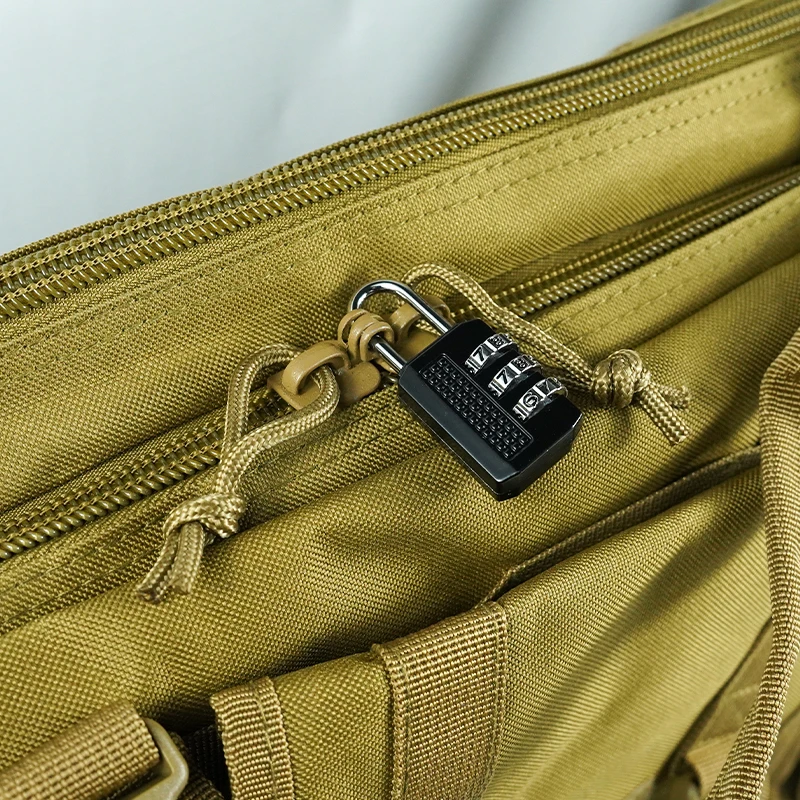 Material: MHecho de tela de nailon 600D, duradero, resistente al agua y resistente.Cremalleras estilo cerradura para el compartimento principal (las cremalleras no incluyen cerradura)Colo:Negro/caqui/verde militarFunción: **Contenido del paquete:*Bolsa principal * 1Almohadilla Molle extraíble2Partición interior extraíble*2Correa de hombro * 1Cerradura con cremallera * 1