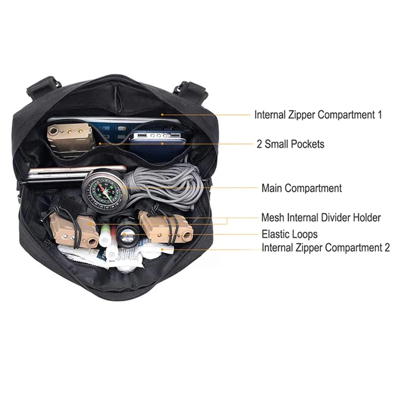 3. ORGANIZACIÓN ÚLTIMA FUNCIONAL: La bolsa Molle Utility tiene 2 compartimentos, suficiente para sostener un teléfono móvil, baterías de repuesto de radio, tijeras compactas para traumatismos, guantes, paquete de baterías ligeramente, buscapersonas, linterna, bolígrafos y Guía de Respuesta de Emergencia. Los bucles elásticos horizontales frontales le permiten tomar y almacenar fácilmente palos luminosos, bolígrafos tácticos, linternas y otras herramientas con forma de palo
