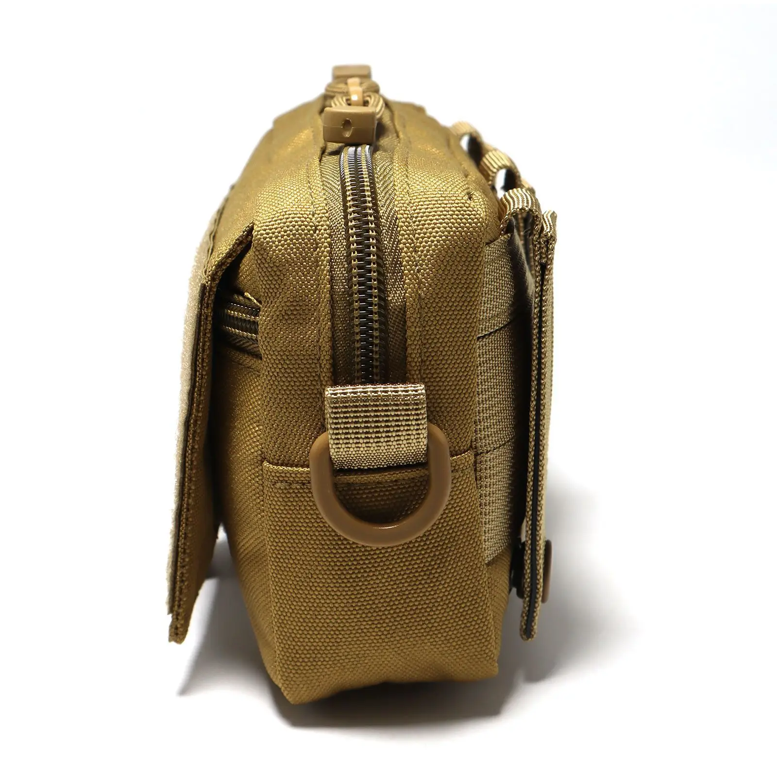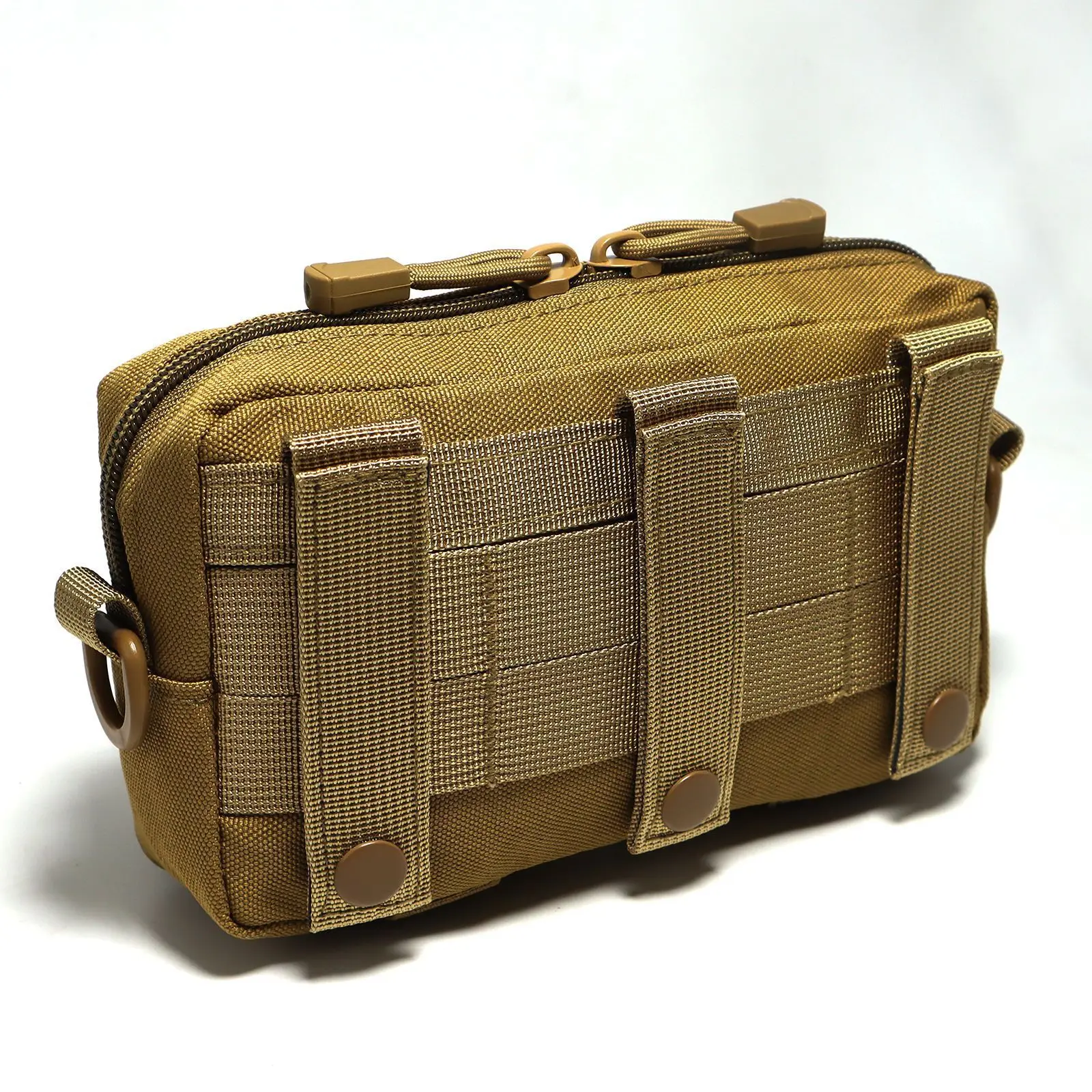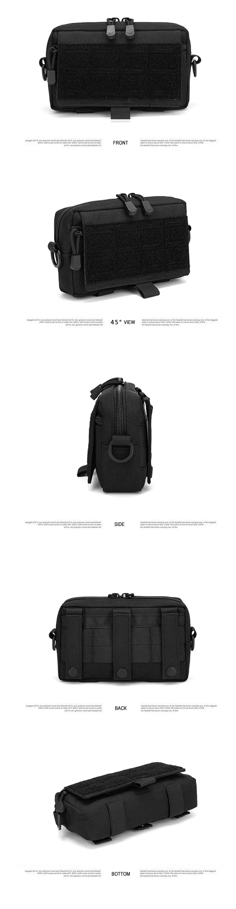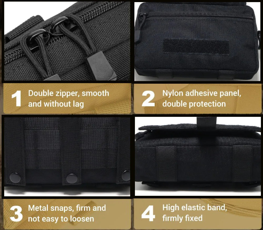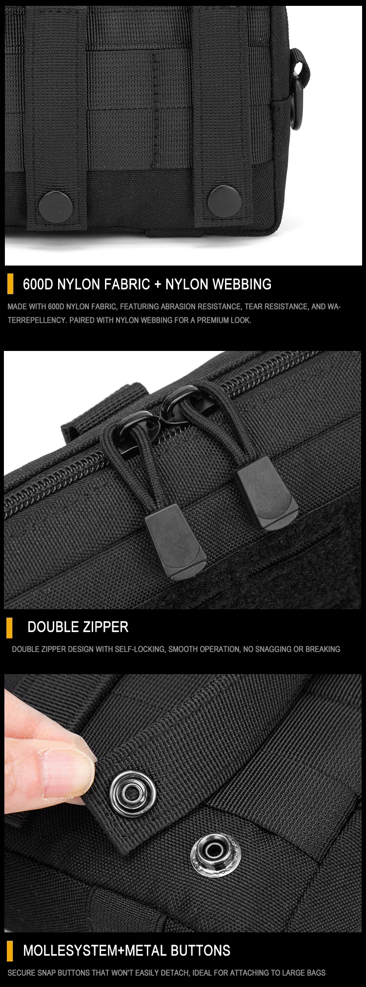 Características 1.PANEL MOLLE CORTADO POR LAER: La bolsa táctica molle está cubierta con un panel de bucle MOLLE cortado con láser de 6,7 ''*3.2''. Agregue herramientas EDC adicionales o equipo Molle a la bolsa táctica Molle según sea necesario para ampliar la capacidad de carga y agregue sus parches favoritos para personalizarlo aún más. ¡Mano gratis! El panel de solapa frontal se puede abrir rápidamente con una mano y hay un bolsillo frontal adicional con cremallera detrás de la solapa para guardar identificación, cambio, pequeñas herramientas EDC y más. 2. CALIDAD PREMIUM: La bolsa Molle admin está hecha de nailon de alta calidad que es resistente a desgarros y salpicaduras para mayor durabilidad. La bolsa táctica está equipada con cremalleras impermeables para proteger sus pertenencias de la lluvia, la arena y el polvo. La resistente cremallera doble facilita abrir rápidamente la bolsa táctica para llevar su teléfono o herramientas con una o ambas manos. Pequeñas bolsas tácticas tamaño 7,5”L *2”W *4,3”H (19cm*5cm*11cm). 3.ESPACIO DE ALMACENAMIENTO ADECUADO: El bolsillo principal de la bolsa molle está dividido en tres compartimentos. En un lado hay un bolsillo de malla transparente alveolar para llaves, tarjetas y otros artículos de uso frecuente, lo que facilita descubrir lo que necesita. En el otro lado hay un bolsillo interior de cuerpo entero que no solo sostiene fácilmente su teléfono (apto para teléfonos de 4,7 a 6,7"), sino también como bolsa de herramientas para guardar linterna, bloc de notas pequeño, mapa, brújula, bolígrafo táctico, herramienta EDC multifunción. 4. SISTEMA MOLLE COMPATIBLE: La bolsa táctica tiene 3 correas Molle en la parte posterior para agregar fácilmente la bolsa táctica modular como una bolsa externa adicional a su equipo MOLLE, como un chaleco de transporte táctico, un cinturón o una mochila táctica. La bolsa táctica se adapta a cinturones de hasta 2 pulgadas de ancho y se puede utilizar como riñonera EDC.Las bolsas tácticas se pueden utilizar como un práctico kit de herramientas para las patrullas de servicio y la vida cotidiana. 5.VERSÁTIL: Las bolsas tácticas pesan solo 0,16 kg, son livianas e ideales para tareas de patrulla, viajes a largo plazo y uso interrumpido. Conecte la bolsa táctica a su cinturón para convertirla en una bolsa EDC o una bolsa de herramientas táctica funcional. La bolsa táctica tiene anillos en D en ambos lados, se pueden agregar correas para convertirla en una bolsa de herramientas edc. Dos correas elásticas en la parte inferior sujetan un torniquete o cordón de paracaídas. Puedes crear combinaciones exclusivas de paquetes tácticos según tus propios hábitos de uso y realidad.