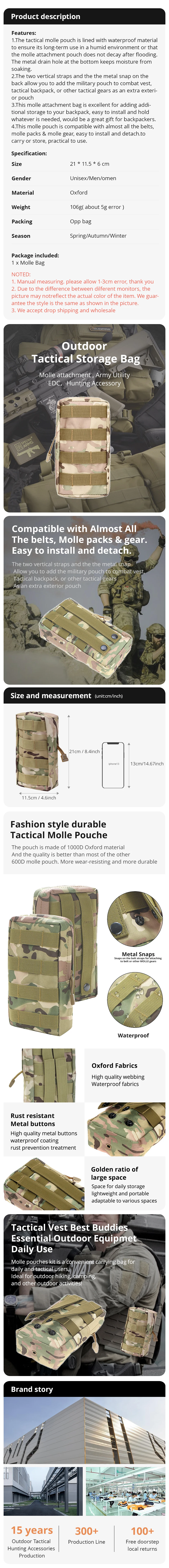 1. El interior de la bolsa molle táctica está forrado con material impermeable para asegurar su uso a largo plazo en un ambiente húmedo o que la bolsa de fijación molle no decaiga después de las inundaciones. El agujero de drenaje de metal en la parte inferior mantiene la humedad de remojo.