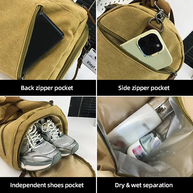 1.Configuración de bolsa principal de gran capacidad, cremallera incorporada y bolsillos insertados con compartimento independiente para zapatos y bolsillos separadores húmedos/secos, y configuración de múltiples bolsillos en el cuerpo de la bolsa.Almacenamiento de partición, fácil acceso