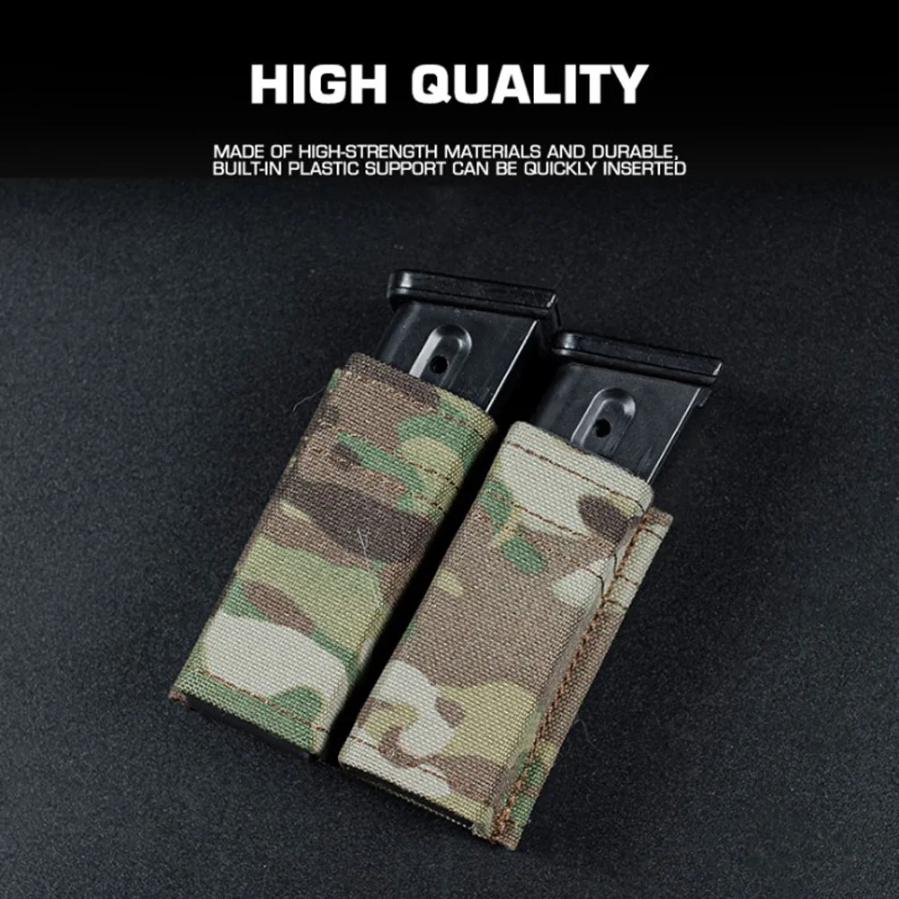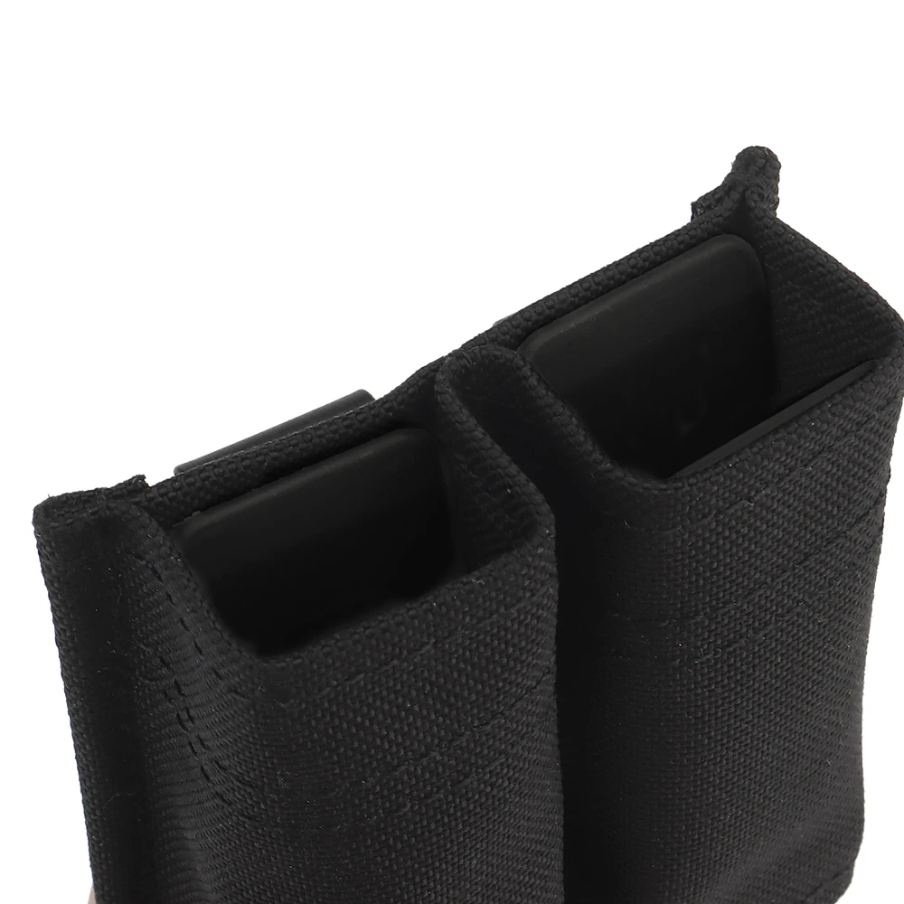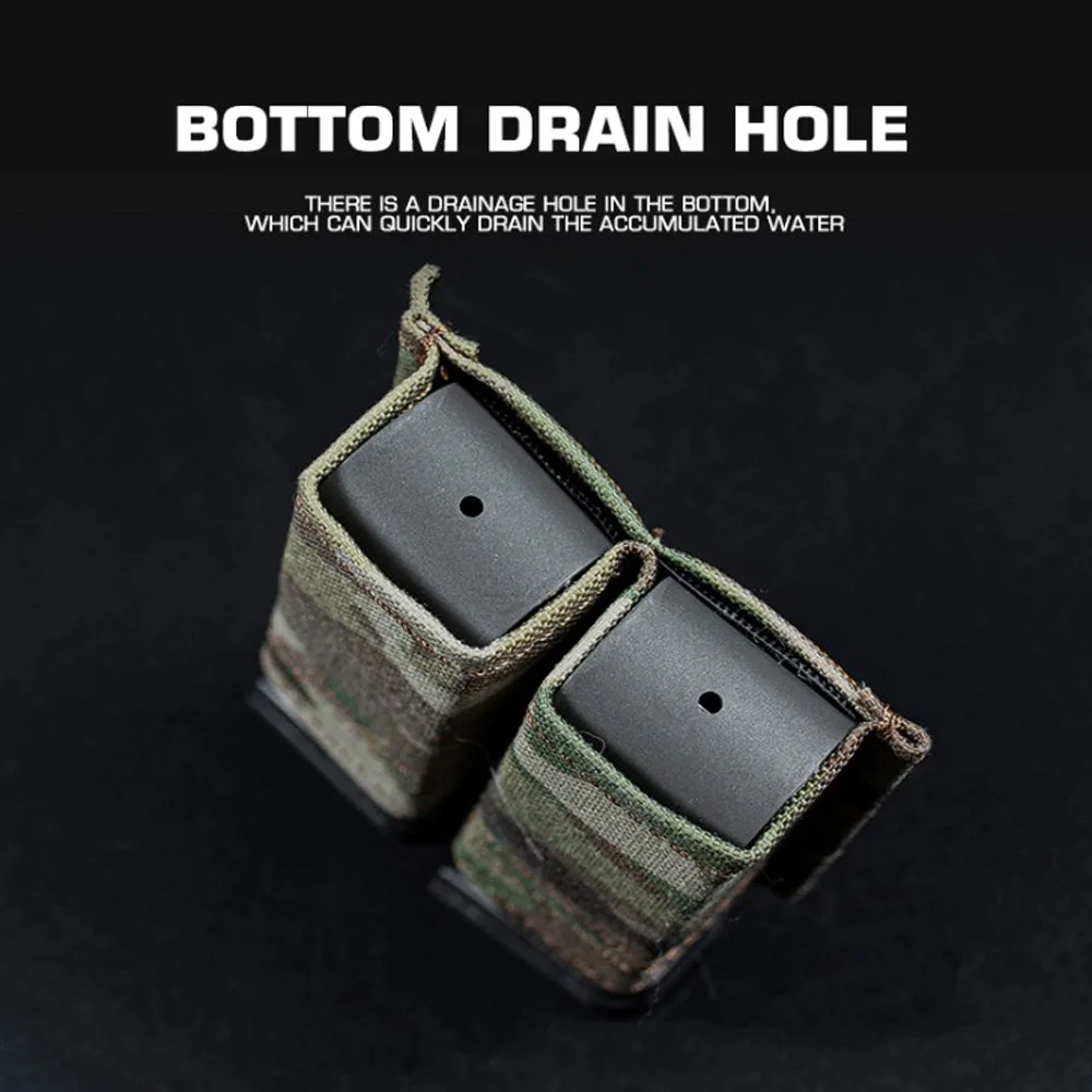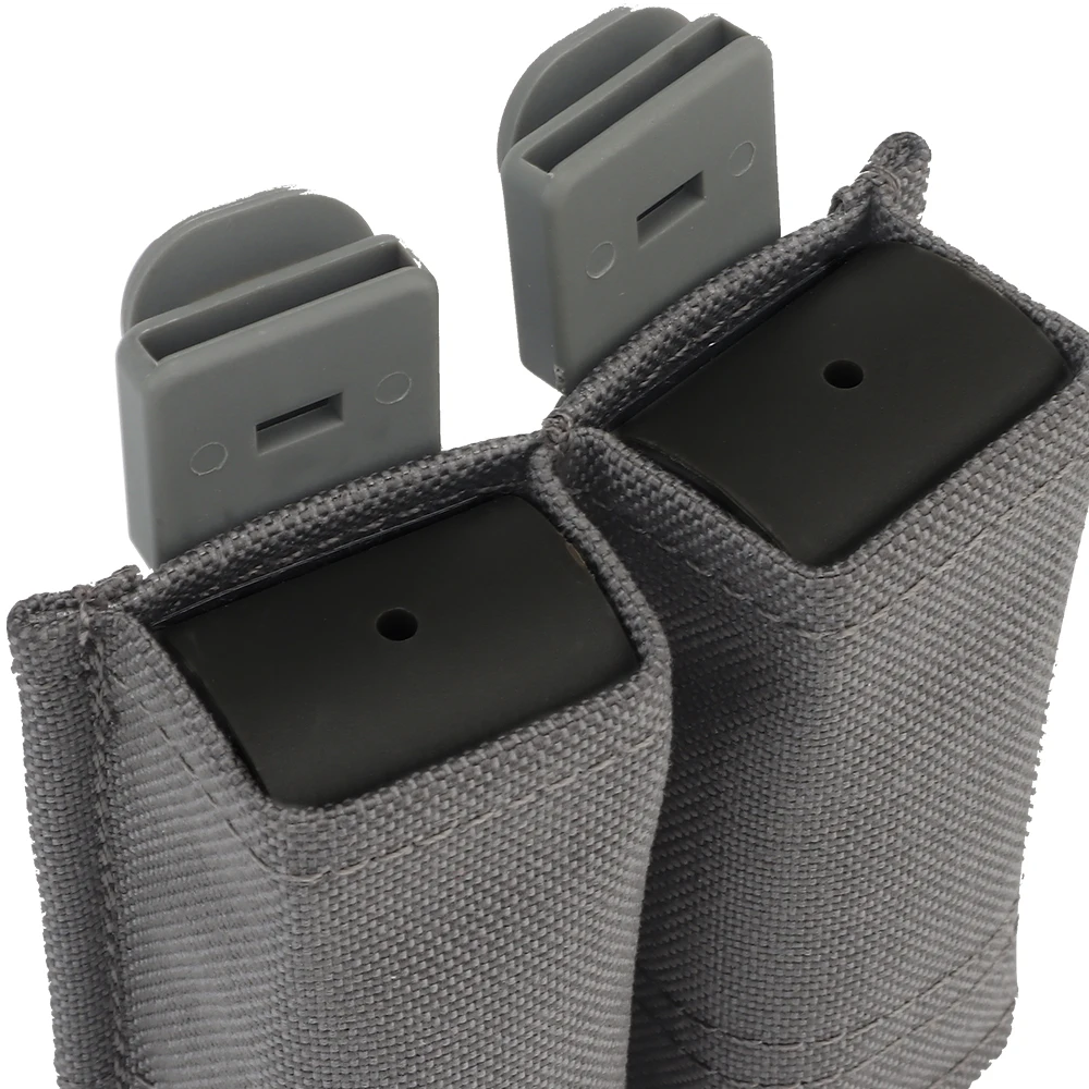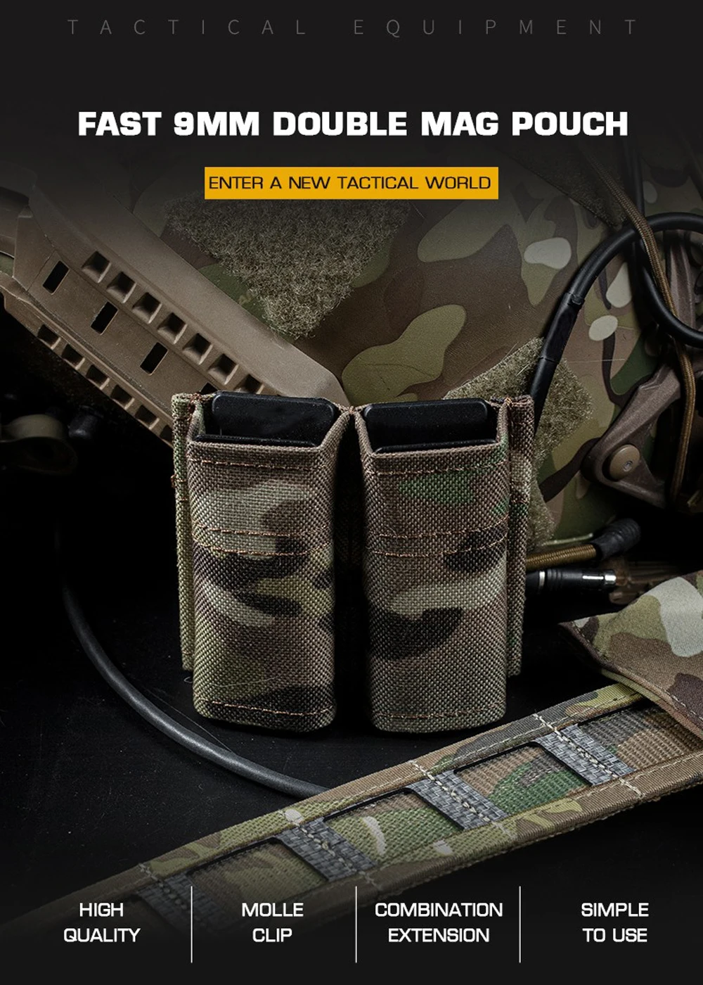 Nombre del producto: bolsa doble FAST de 9MM Número de artículo.:MG-F-04 Tamaño del producto: 9*3,5*10,8 cm Peso neto del producto: 0,076 kg Material principal: tela mate/tela CORDURA. Escena aplicable: caza, deportes al aire libre y otros deportes tácticos de airsoft, etc.