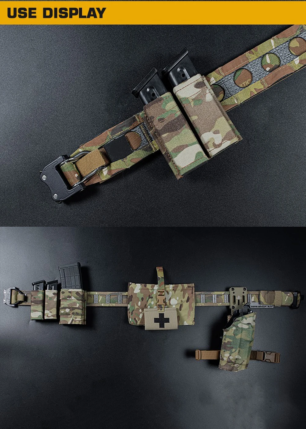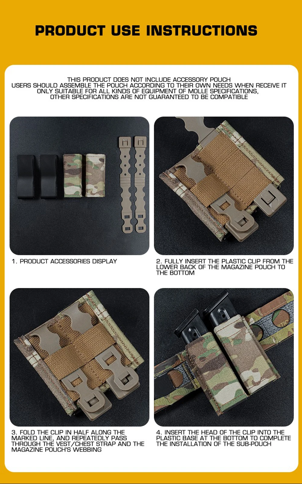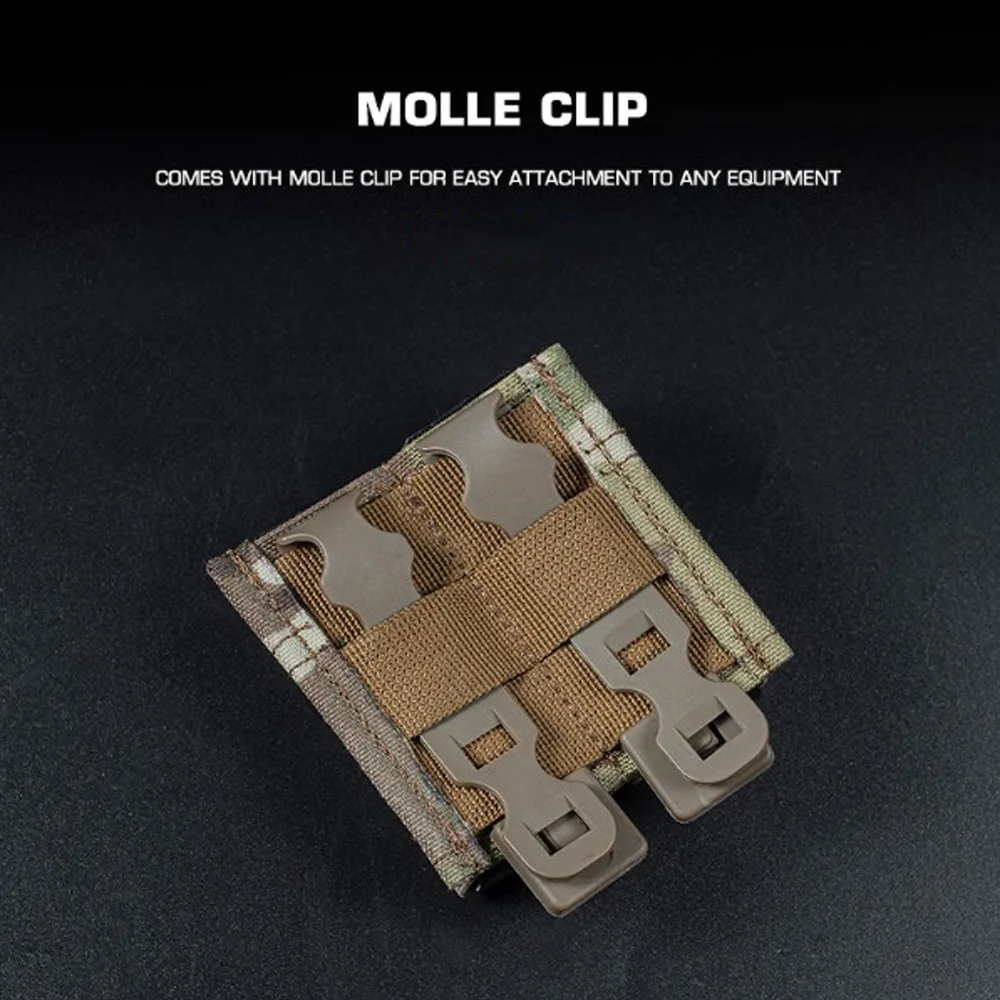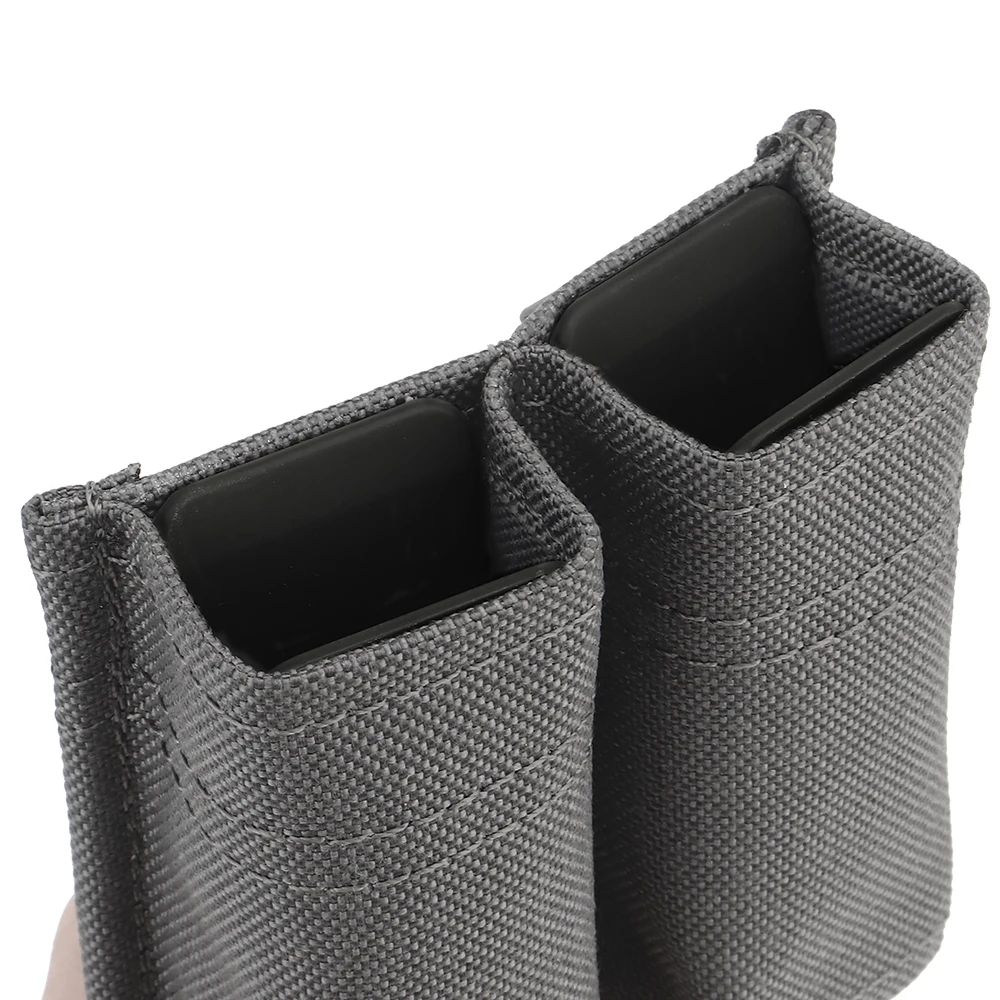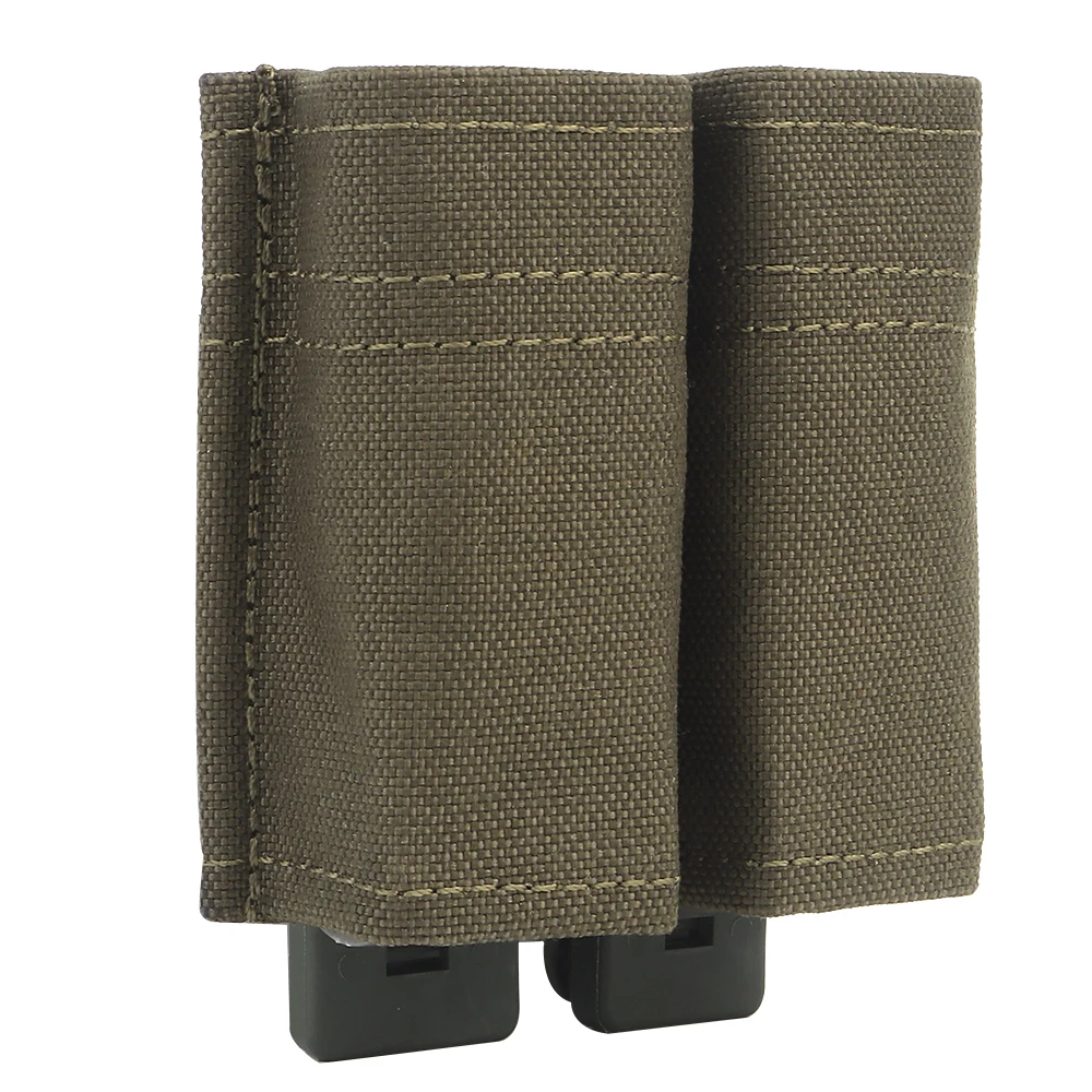 Nombre del producto: bolsa doble FAST de 9MM Número de artículo.:MG-F-04 Tamaño del producto: 9*3,5*10,8 cm Peso neto del producto: 0,076 kg Material principal: tela mate/tela CORDURA. Escena aplicable: caza, deportes al aire libre y otros deportes tácticos de airsoft, etc.