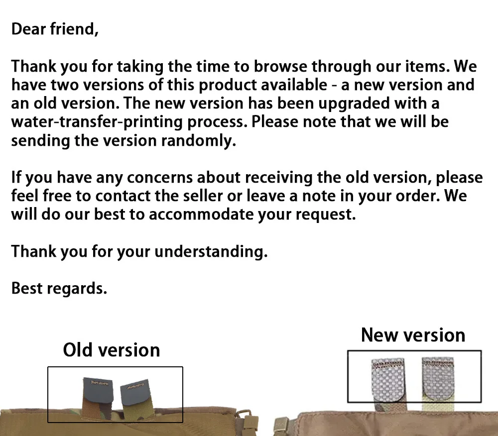 Gracias por tomarse el tiempo para navegar a través de nuestros artículos.Tenemos dos versiones de este producto disponibles: una nueva versión y una versión antigua. La nueva versión se ha actualizado con un proceso de impresión por transferencia de agua. Tenga en cuenta que enviaremos la versión al azar.