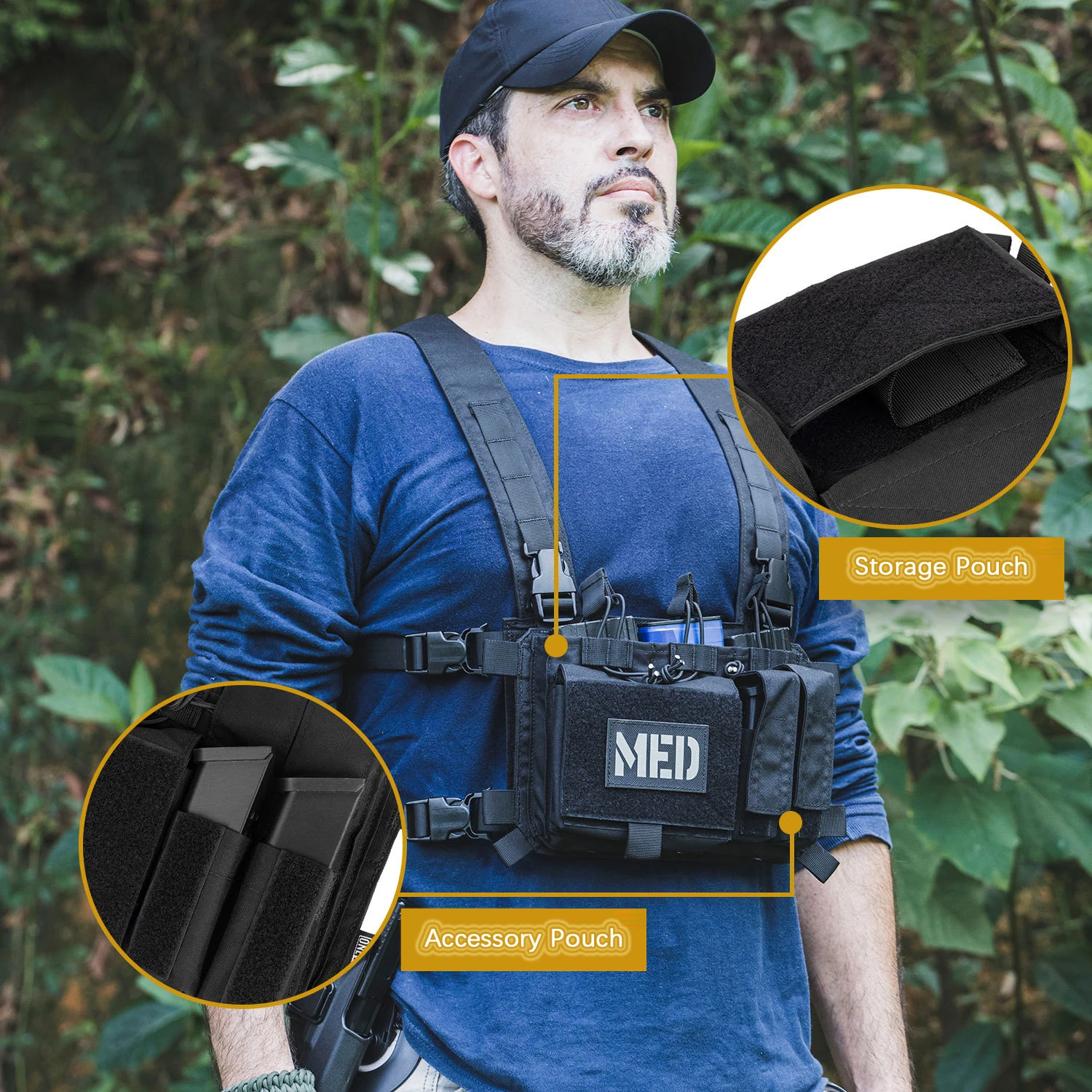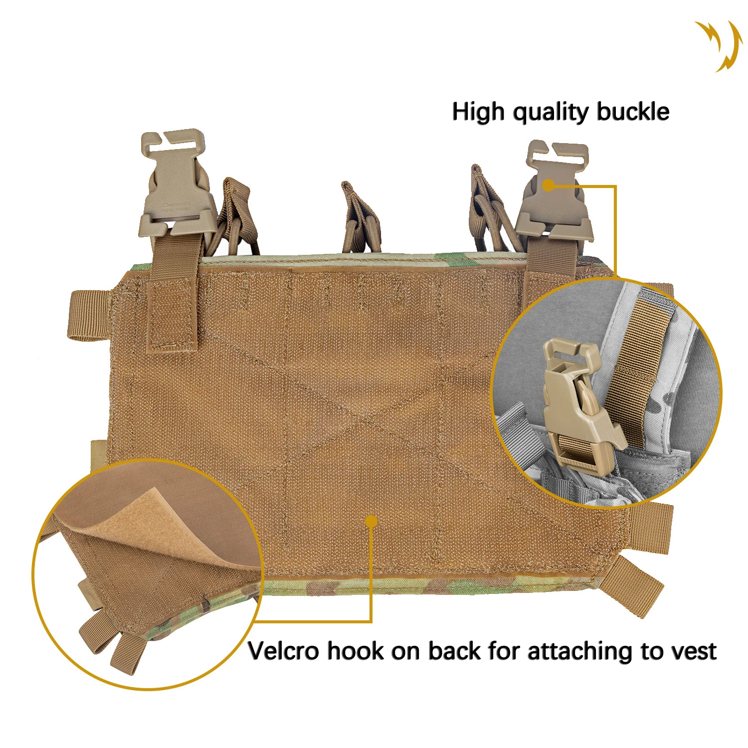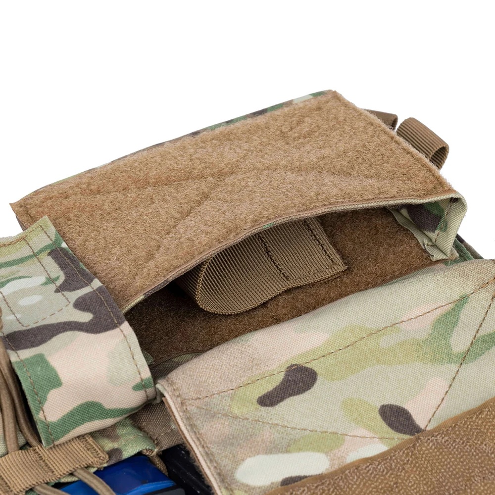 ● Capacidad para tres cargadores de 30 rondas y 5,56 con retenedor de cordón de choque ajustable y lengüeta de correas para un dibujo rápido.