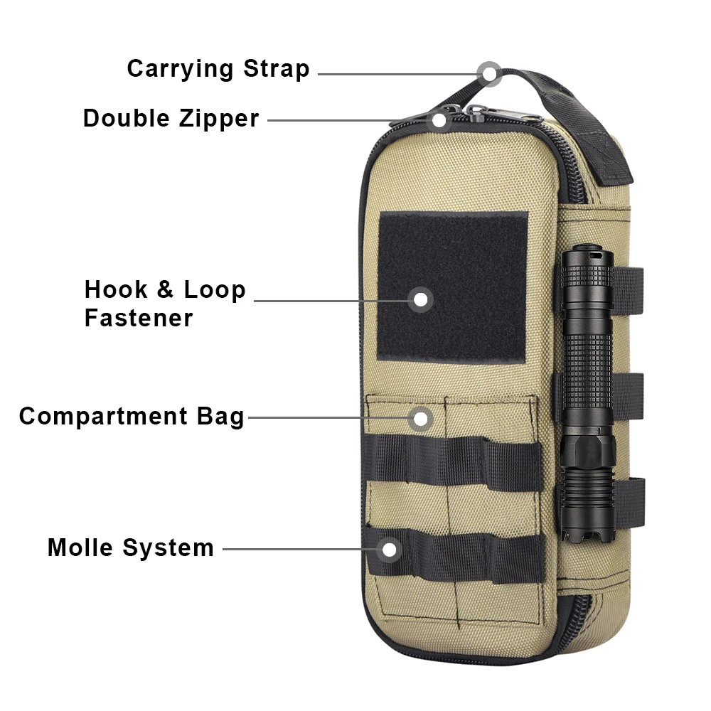 Equipado con correas MOLLE, que le permiten sujetar de forma segura la bolsa a cualquier equipo compatible con MOLLE o ampliar su capacidad agregando bolsas adicionales.