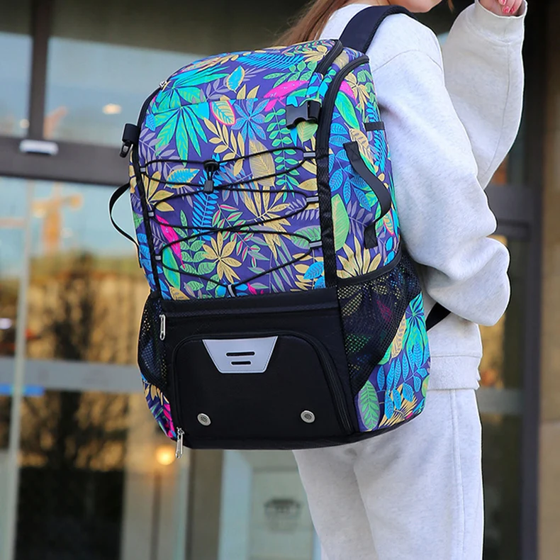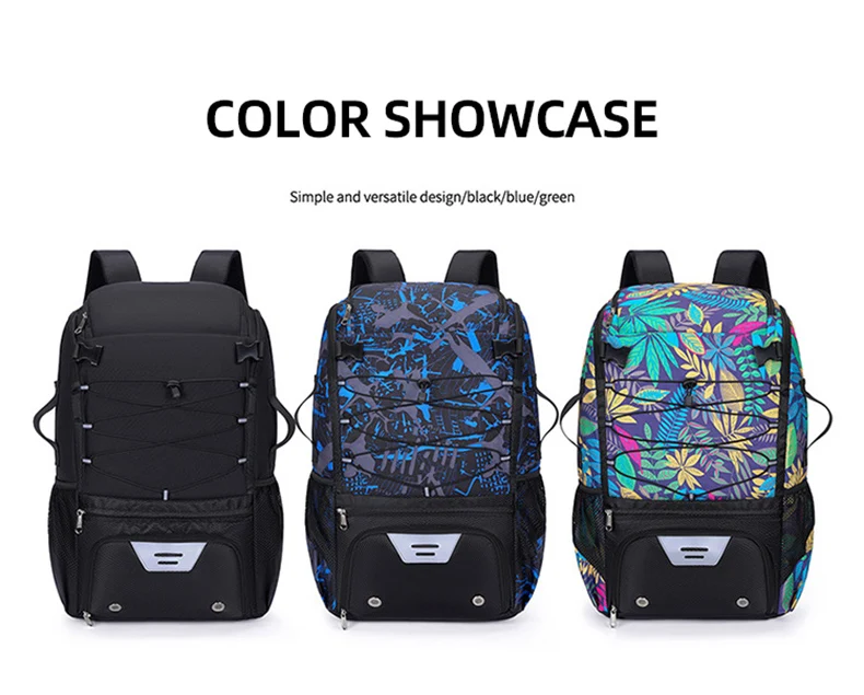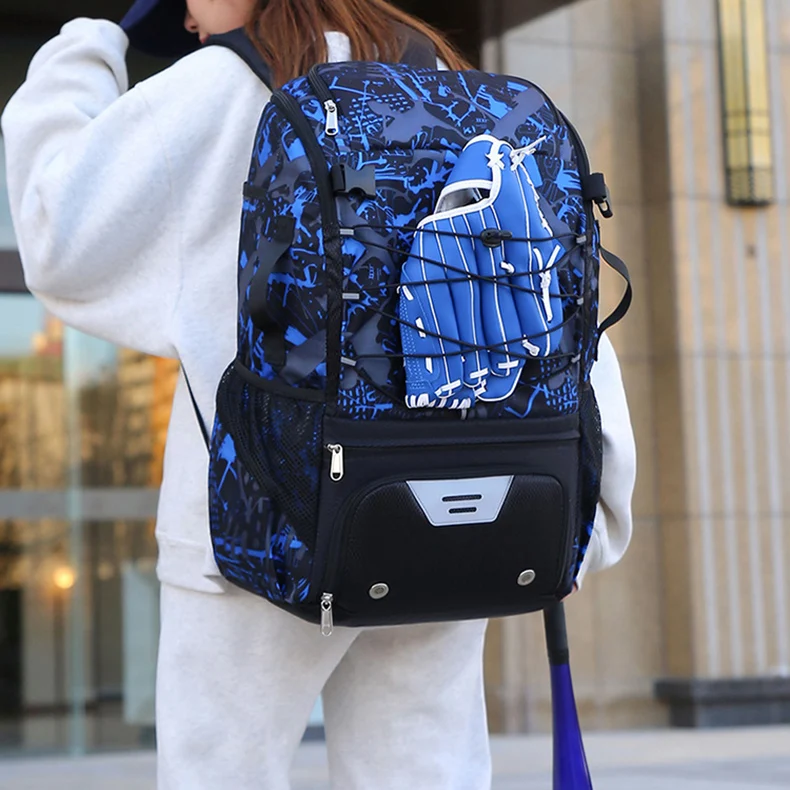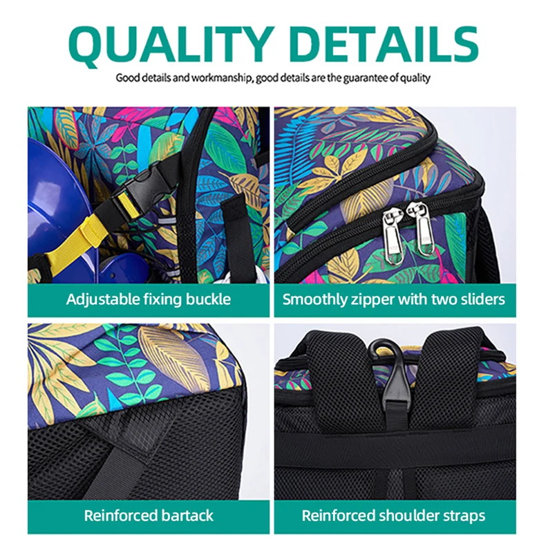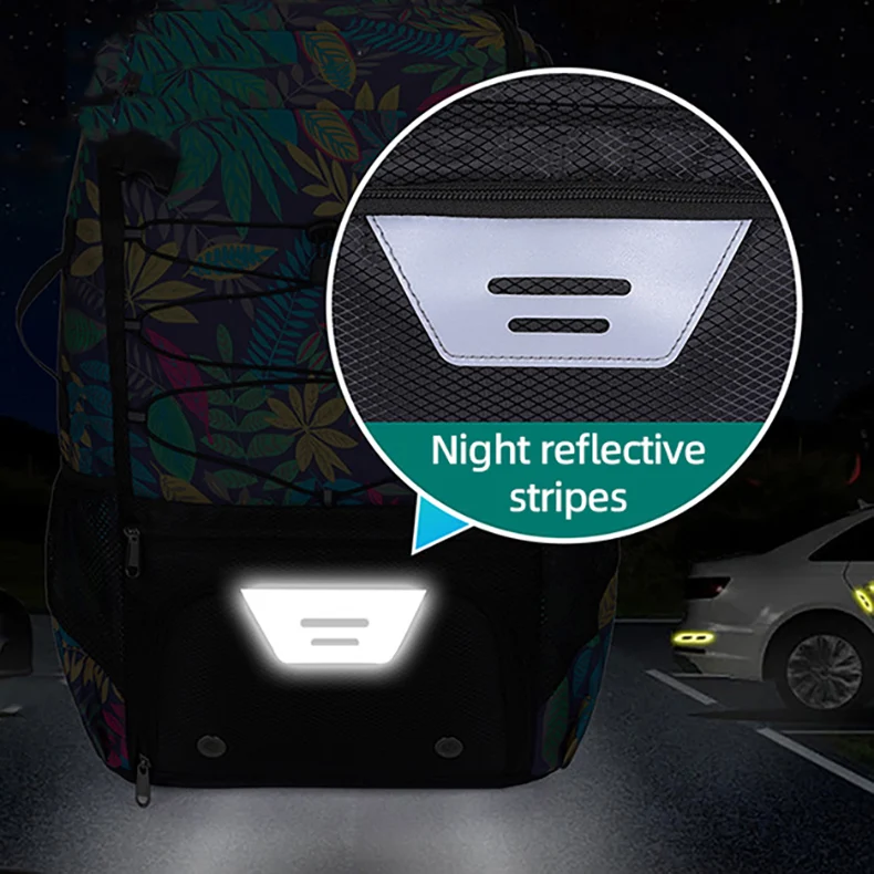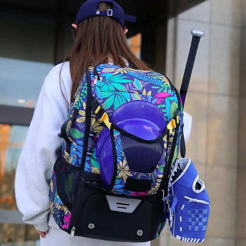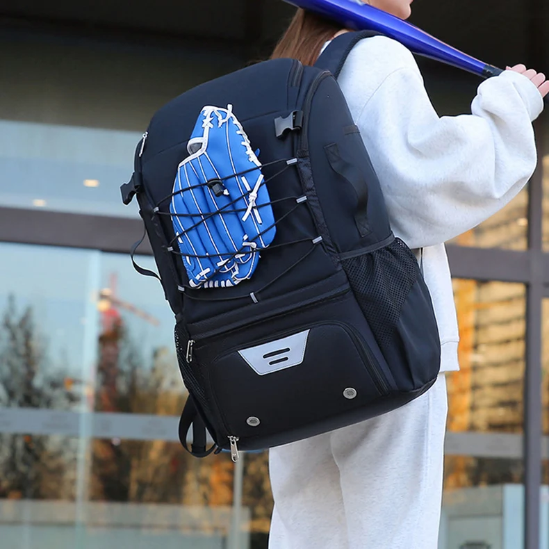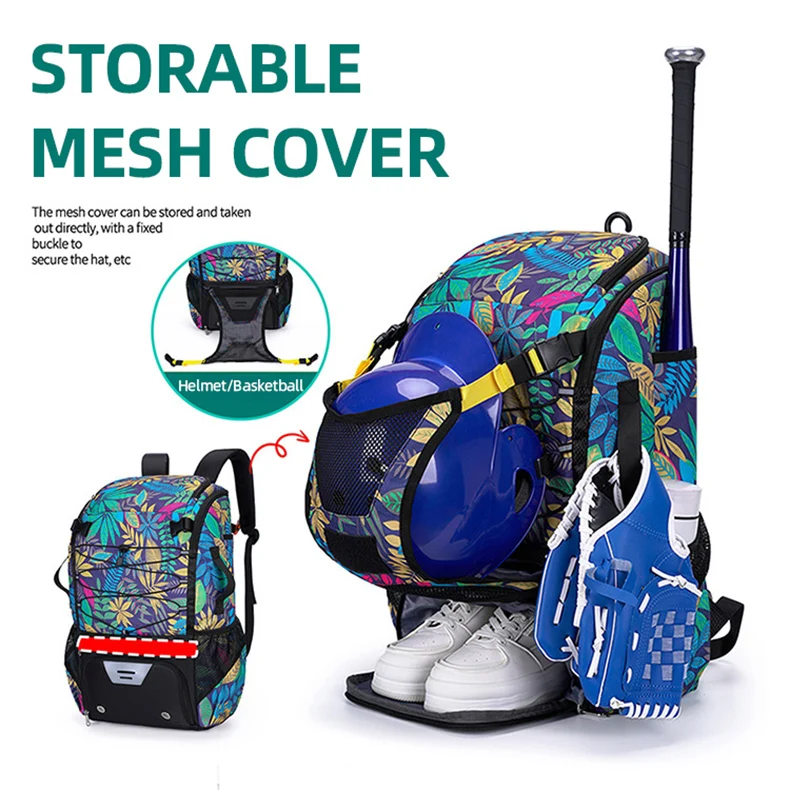 2. Bolsa de béisbol deportiva multifuncional, la estructura de la bolsa incluye cubierta de malla fija, compartimento independiente para zapatos, posición de murciélago, área de separación húmeda y seca, tira reflectante de seguridad nocturna, mosquetones con silbato.