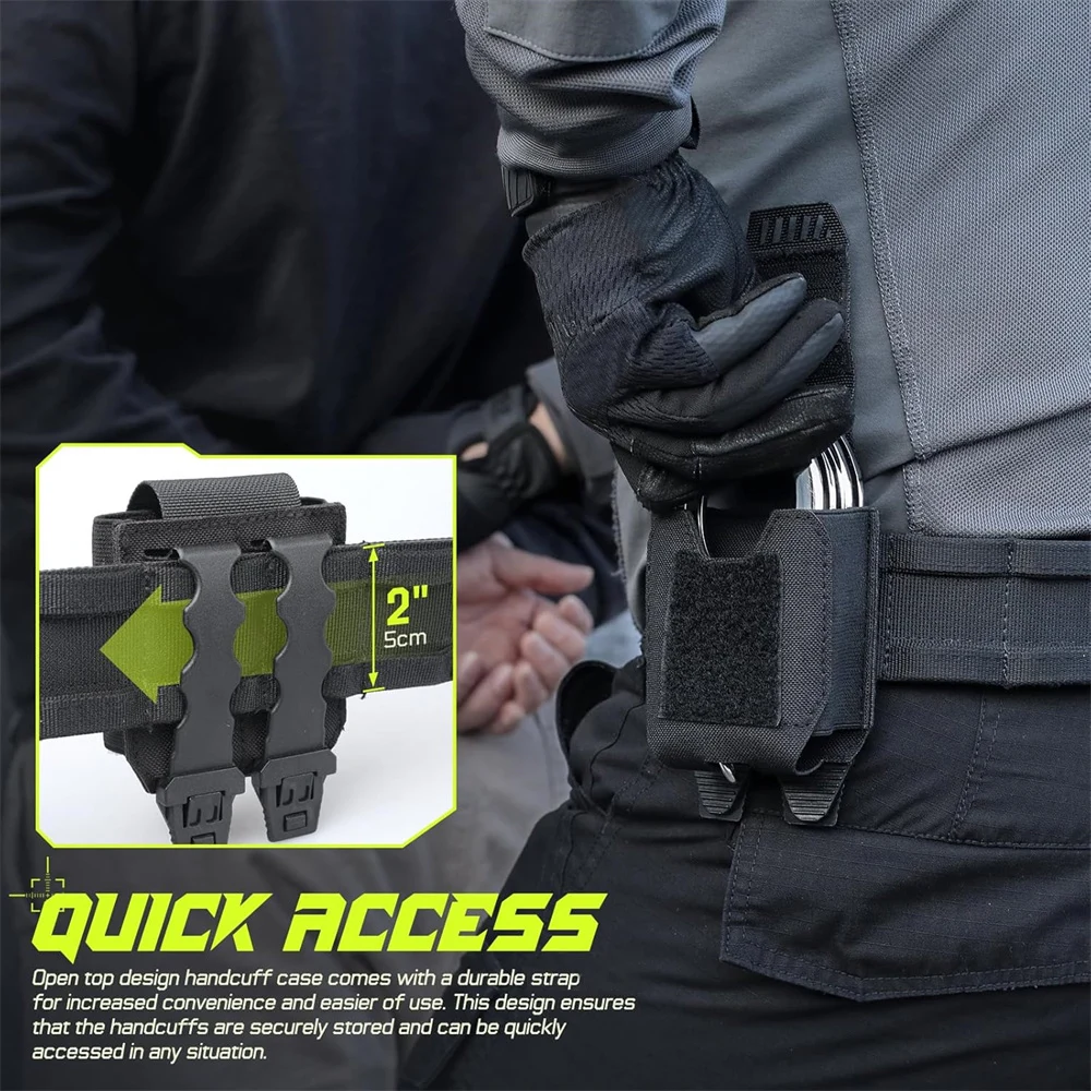 El soporte para esposas para las fuerzas del orden es compatible con un par de esposas para agentes de la ley, agentes de seguridad, advertencias, agentes correccionales, guardaespaldas y otras personas que necesitan llevar esposas en su trabajo diario.Son accesorios ideales para equipos policiales.