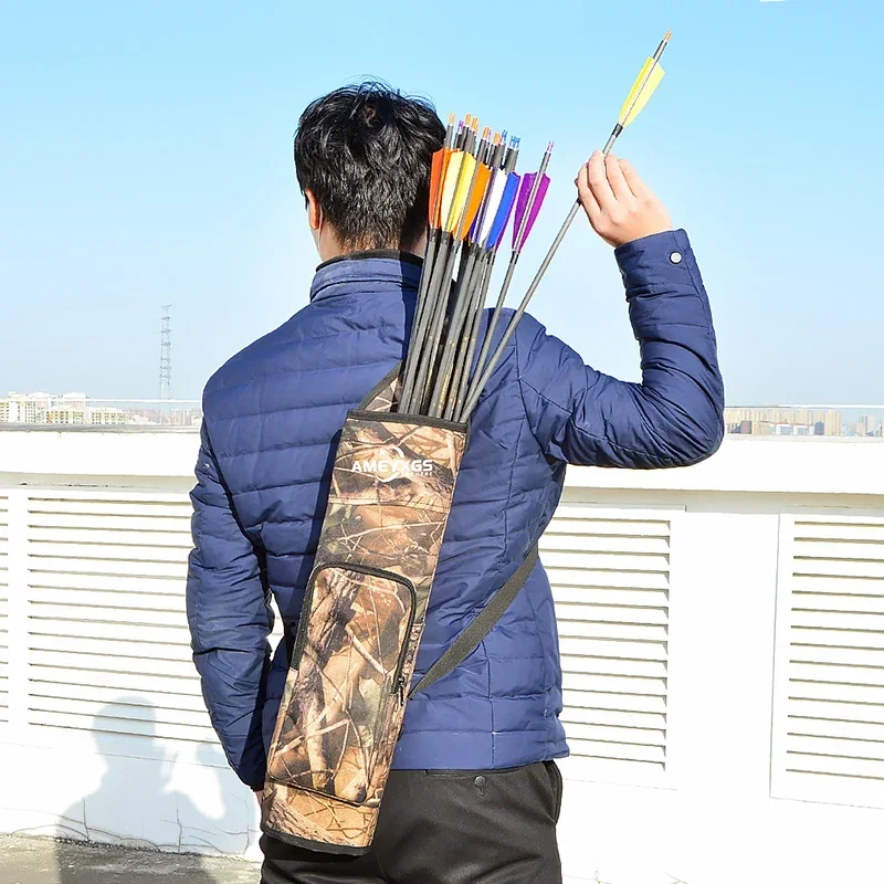 Nombre del artículo: Carcaj de flecha de tiro con arco Color: negro, camuflado Material: tela impermeable, tela Oxford Peso: alrededor de 460 g Ligero y cómodo Paquete: 1 Uds. Tamaño: 54,6x14x8cm Características: 1.Gran capacidad, sostiene al máximo 40 flechas a la vez. 2.Fabricado en lona, material muy duradero. 3.Espesor de intensificación, la parte inferior del carcaj está hecha de una partición de PE, que es firme y resistente al desgaste, evitando que las flechas se desgasten por la parte inferior.Compartimento de flechas muy profundo. 4.Diseño de gancho de tres puntos, los bolsillos de los hombros se pueden ajustar en longitud 5.Bolsillo con cremallera para guardar billetera, teléfono y accesorios. 6.Gran accesorio para cazar, disparar y practicar tiro al blanco.Múltiples bolsillos para su comodidad. Nota: Todos los parámetros anteriores se miden manualmente, habrá errores y prevalecerá el producto real.