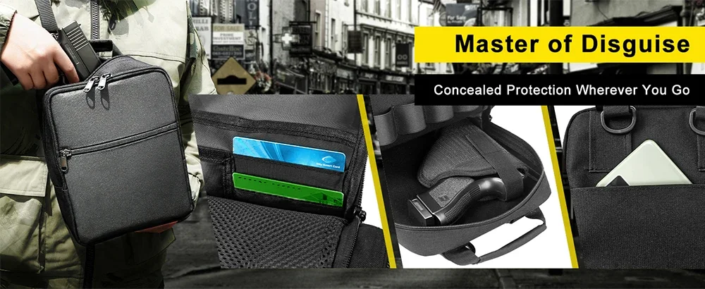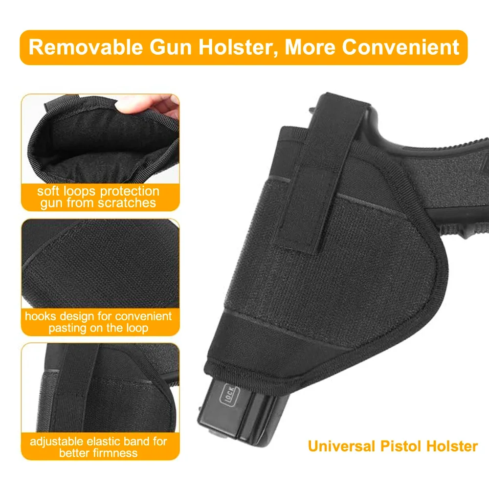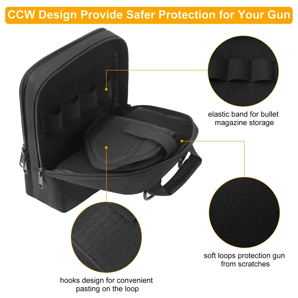 La bolsa para pistola CCW incluye una funda universal desmontable para pistola, un diseño de bucle y gancho para facilitar su colocación, lo que ayuda a mantener la pistola en su posición.Además, también viene con un pequeño candado para mejorar la seguridad de su arma.