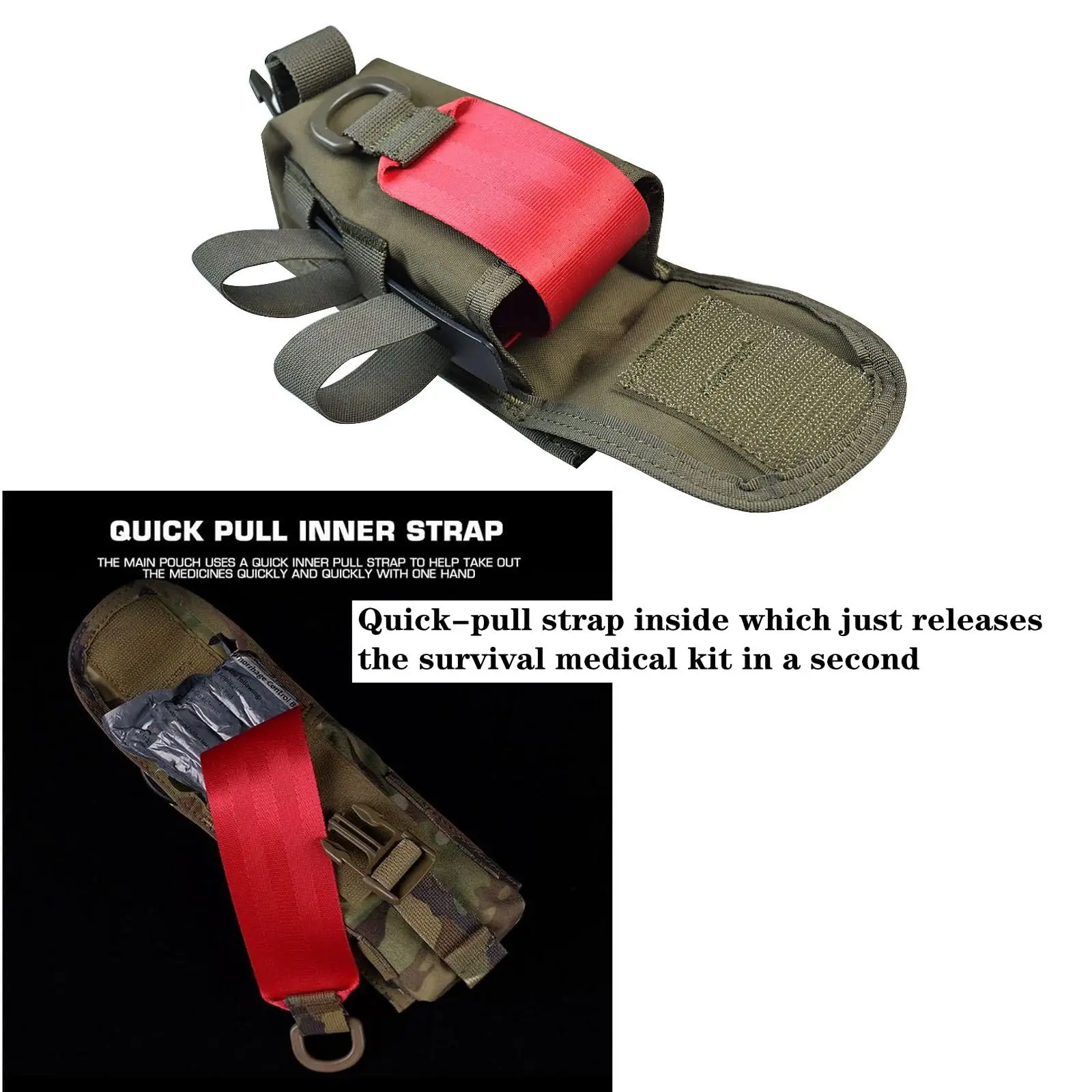 PERFECT COMPACT BLOWOUT POUCH,QUICK-PULL INTERIOR STRAP DESIGN The blowout trauma pouch has quick-pull strap inside which just releases the survival medical kit in a second. This blowout design intends to get the medical kits immediately and bring succour to the wounded quickly.
