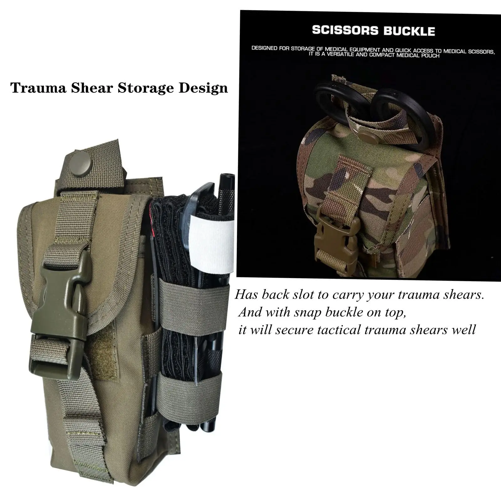 MOLLE-COMPATIBLE POUCH :Tactical Medical Pouch MOLLE webbing on both side , It provides with extra space to small medical kits external, such as emergency chemical light, pen, needle decompression or CAT TQ.